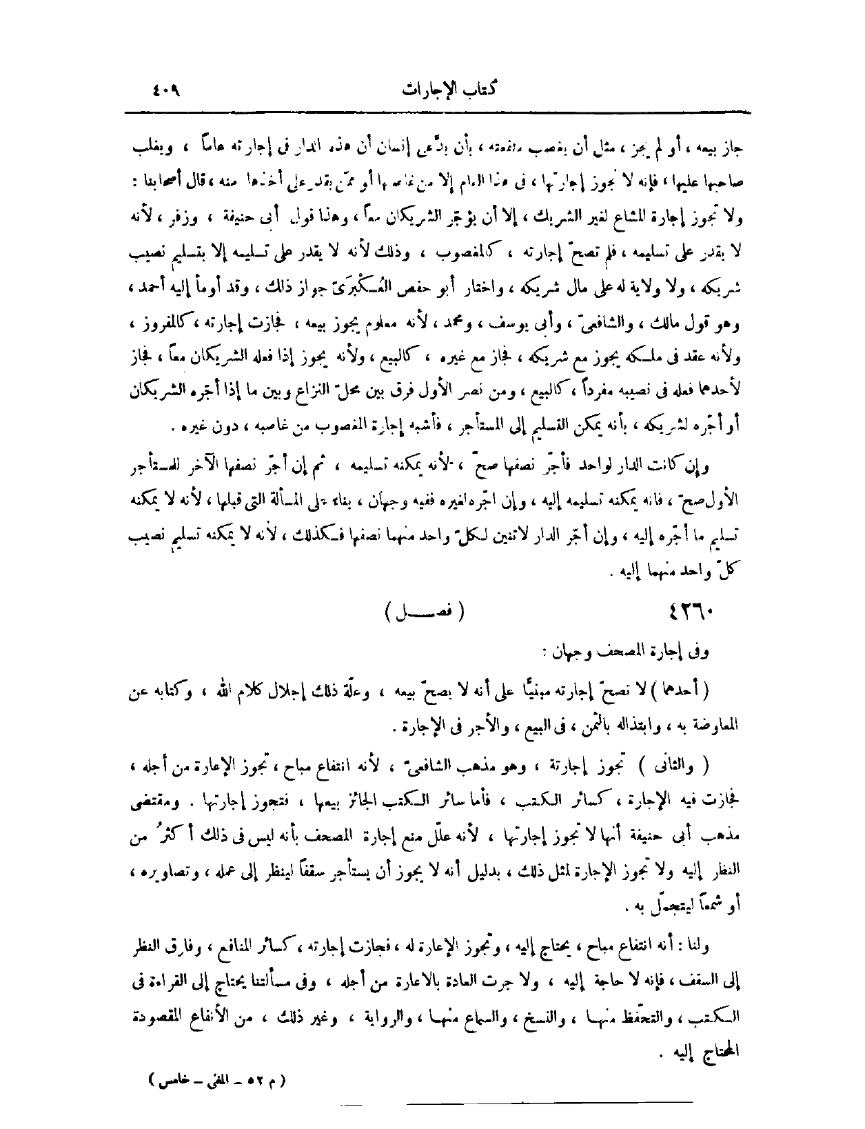(٤٣٢٠) فَصْلٌ: وَفِي إجَارَةِ الْمُصْحَفِ وَجْهَانِ أَحَدُهُمَا لَا تَصِحُّ إجَارَتُهُ، مَبْنِيًّا عَلَى أَنَّهُ لَا يَصِحُّ بَيْعُهُ، وَعِلَّةُ ذَلِكَ إجْلَالُ كَلَامِ اللَّهِ وَكِتَابِهِ عَنْ الْمُعَاوَضَةِ بِهِ، وَابْتِذَالِهِ بِالثَّمَنِ فِي الْبَيْعِ، وَالْأَجْرِ فِي الْإِجَارَةِ. وَالثَّانِي، تَجُوزُ إجَارَتُهُ. وَهُوَ مَذْهَبُ الشَّافِعِيِّ؛ لِأَنَّهُ انْتِفَاعٌ مُبَاحٌ، تَجُوزُ الْإِعَارَةُ مِنْ أَجْلِهِ، فَجَازَتْ فِيهِ الْإِجَارَةُ، كَسَائِرِ الْكُتُبِ، فَأَمَّا سَائِرُ الْكُتُبِ الْجَائِزِ بَيْعُهَا، فَتَجُوزُ إجَارَتُهَا