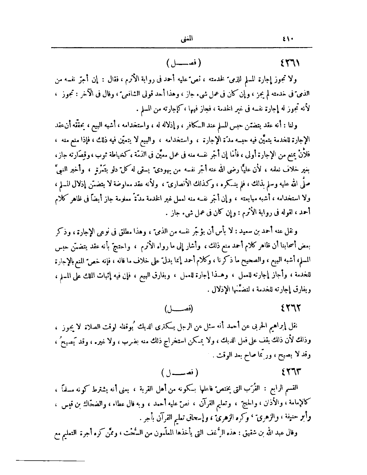 (٤٣٢١) فَصْلٌ: وَلَا تَجُوزُ إجَارَةُ الْمُسْلِمِ لِلذِّمِّيِّ لِخِدْمَتِهِ. نَصَّ عَلَيْهِ أَحْمَدُ، فِي رِوَايَةِ الْأَثْرَمِ، فَقَالَ: إنْ آجَرَ نَفْسَهُ مِنْ الذِّمِّيِّ فِي خِدْمَتِهِ، لَمْ يَجُزْ، وَإِنْ كَانَ فِي عَمَلِ شَيْءٍ، جَازَ. وَهَذَا أَحَدُ قَوْلَيْ الشَّافِعِيِّ، وَقَالَ فِي الْآخَرِ: تَجُوزُ؛ لِأَنَّهُ تَجُوزُ لَهُ إجَارَةُ نَفْسِهِ فِي غَيْرِ الْخِدْمَةِ، فَجَازَ فِيهَا، كَإِجَارَتِهِ مِنْ الْمُسْلِمِ. وَلَنَا أَنَّهُ عَقْدٌ يَتَضَمَّنُ حَبْسَ الْمُسْلِمِ عِنْدَ الْكَافِرِ، وَإِذْلَالَهُ لَهُ، وَاسْتِخْدَامَهُ، أَشْبَهَ الْبَيْعَ، يُحَقِّقُهُ أَنَّ عَقْدَ الْإِجَارَةِ لِلْخِدْمَةِ يَتَعَيَّنُ فِيهِ حَبْسُهُ مُدَّةَ الْإِجَارَةِ وَاسْتِخْدَامُهُ، وَالْبَيْعُ لَا يَتَعَيَّنُ فِيهِ ذَلِكَ، فَإِذَا مُنِعَ مِنْهُ، فَلَأَنْ يُمْنَعَ مِنْ الْإِجَارَةِ أَوْلَى