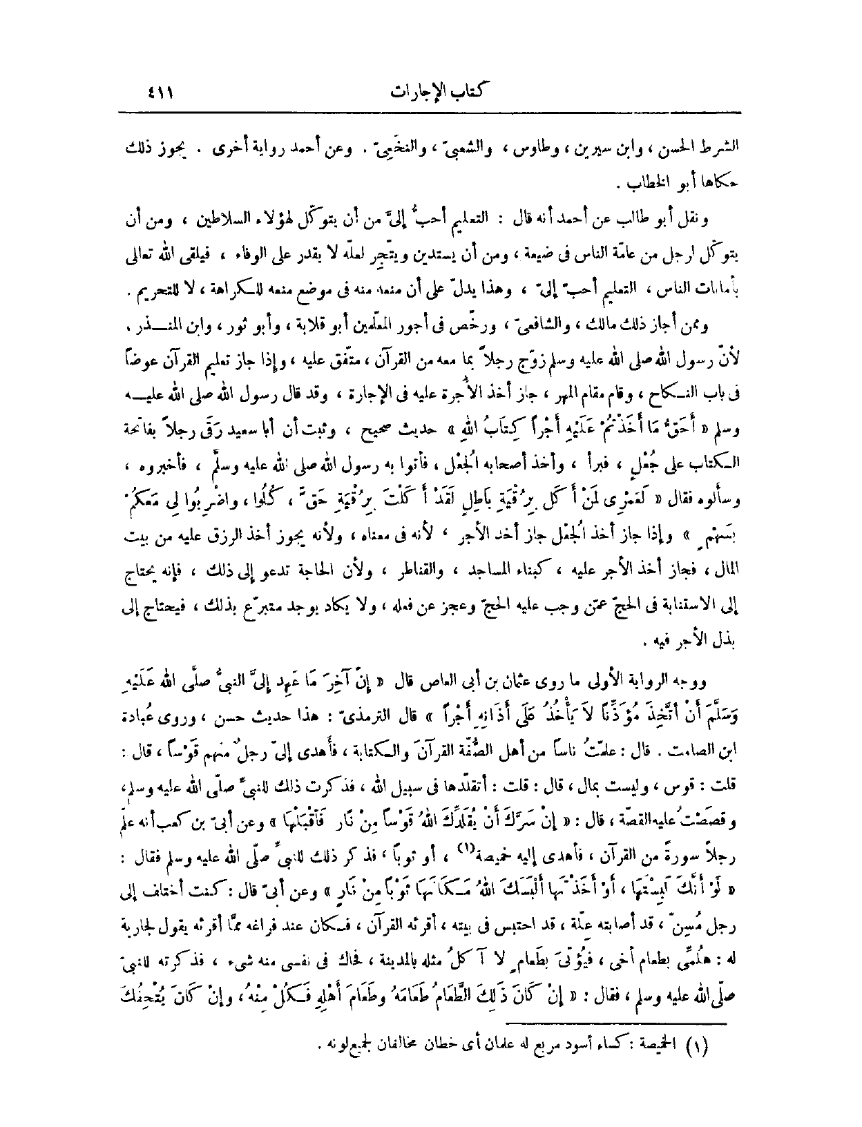 وَرَوَى عُبَادَةُ بْنُ الصَّامِتِ، قَالَ: عَلَّمْتُ نَاسًا مِنْ أَهْلِ الصُّفَّةِ الْقُرْآنَ وَالْكِتَابَةَ، فَأَهْدَى إلَيَّ رَجُلٌ مِنْهُمْ قَوْسًا، قَالَ: قُلْت: قَوْسٌ وَلَيْسَتْ بِمَالٍ. قَالَ: قُلْت أَتَقَلَّدُهَا فِي سَبِيلِ اللَّهِ. فَذَكَرْت ذَلِكَ لِلنَّبِيِّ - صَلَّى اللَّهُ عَلَيْهِ وَسَلَّمَ -. وَقَصَّ عَلَيْهِ الْقِصَّةَ، قَالَ: «إنْ سَرَّك أَنْ يُقَلِّدَك اللَّهُ قَوْسًا مِنْ نَارٍ، فَاقْبَلْهَا» . وَعَنْ أُبَيِّ بْنِ كَعْبٍ، أَنَّهُ «عَلَّمَ رَجُلًا سُورَةً مِنْ الْقُرْآنِ، فَأَهْدَى إلَيْهِ خَمِيصَةً أَوْ ثَوْبًا، فَذَكَرَ ذَلِكَ لِلنَّبِيِّ - صَلَّى اللَّهُ عَلَيْهِ وَسَلَّمَ - فَقَالَ: لَوْ أَنَّك لَبِسْتهَا، أَوْ أَخَذَتْهَا، أَلْبَسَك اللَّهُ مَكَانَهَا ثَوْبًا مِنْ نَارٍ»