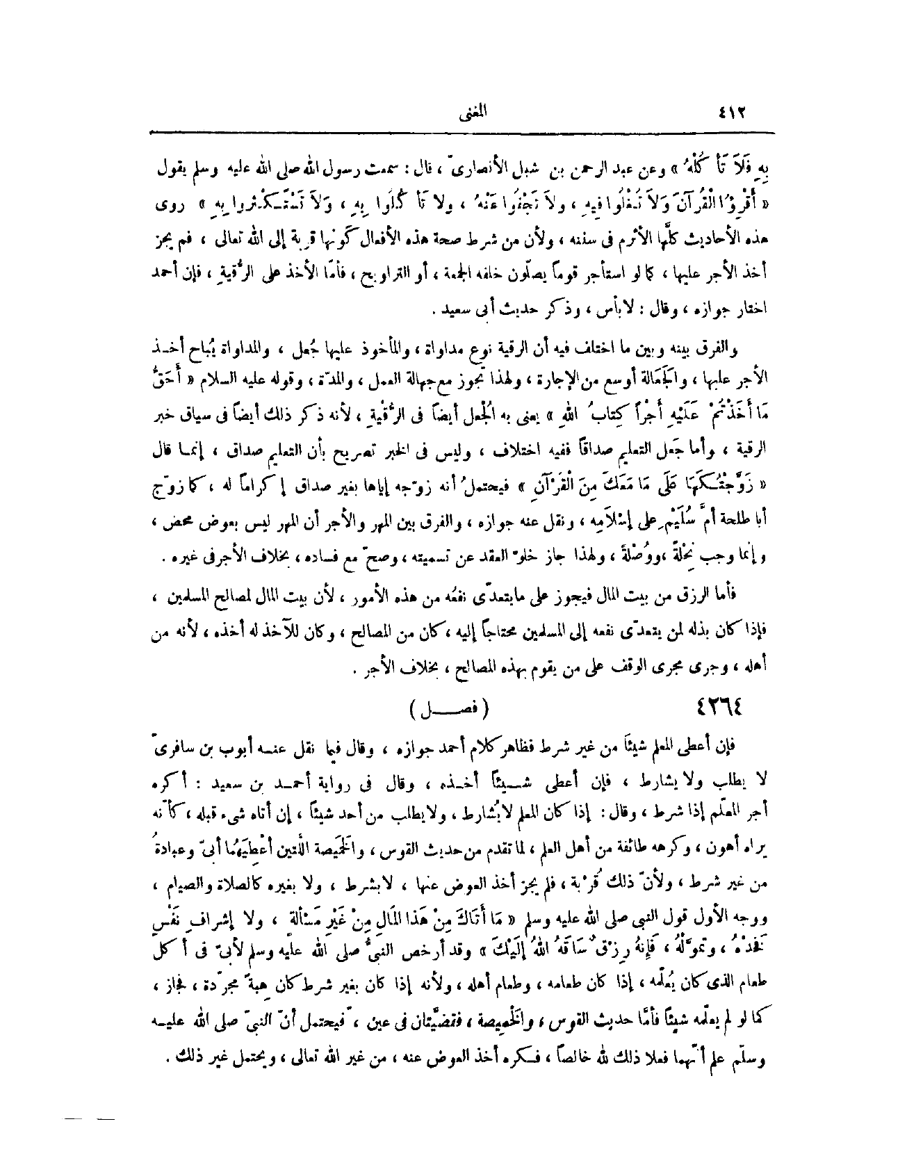 وَلِأَنَّ ذَلِكَ قُرْبَةٌ، فَلَمْ يَجُزْ أَخْذُ الْعِوَضِ عَنْهَا، لَا بِشَرْطٍ وَلَا بِغَيْرِهِ، كَالصَّلَاةِ وَالصِّيَامِ. وَوَجْهُ الْأَوَّلِ، قَوْلُ النَّبِيِّ - صَلَّى اللَّهُ عَلَيْهِ وَسَلَّمَ -: «مَا أَتَاك مِنْ هَذَا الْمَالِ مِنْ غَيْرِ مَسْأَلَةٍ وَلَا إشْرَافِ نَفْسٍ، فَخُذْهُ، وَتَمَوَّلْهُ؛ فَإِنَّهُ رِزْقٌ سَاقَهُ اللَّهُ إلَيْك» . وَقَدْ أَرْخَصَ النَّبِيُّ - صَلَّى اللَّهُ عَلَيْهِ وَسَلَّمَ - لِأُبَيٍّ فِي أَكْلِ طَعَامِ الَّذِي كَانَ يُعَلِّمُهُ، إذَا كَانَ طَعَامَهُ وَطَعَامَ أَهْلِهِ. وَلِأَنَّهُ إذَا كَانَ بِغَيْرِ شَرْطٍ، كَانَ هِبَةً مُجَرَّدَةً، فَجَازَ، كَمَا لَوْ لَمْ يُعَلِّمْهُ شَيْئًا. فَأَمَّا حَدِيثُ الْقَوْسِ وَالْخَمِيصَةِ، فَقَضِيَّتَانِ فِي عَيْنٍ، فَيُحْتَمَلُ أَنَّ النَّبِيَّ - صَلَّى اللَّهُ عَلَيْهِ وَسَلَّمَ - عَلِمَ أَنَّهُمَا فَعَلَا ذَلِكَ لِلَّهِ خَالِصًا، فَكَرِهَ أَخَذَ الْعِوَضِ عَنْهُ مِنْ غَيْرِ اللَّه تَعَالَى. وَيُحْتَمَلُ غَيْرُ ذَلِكَ