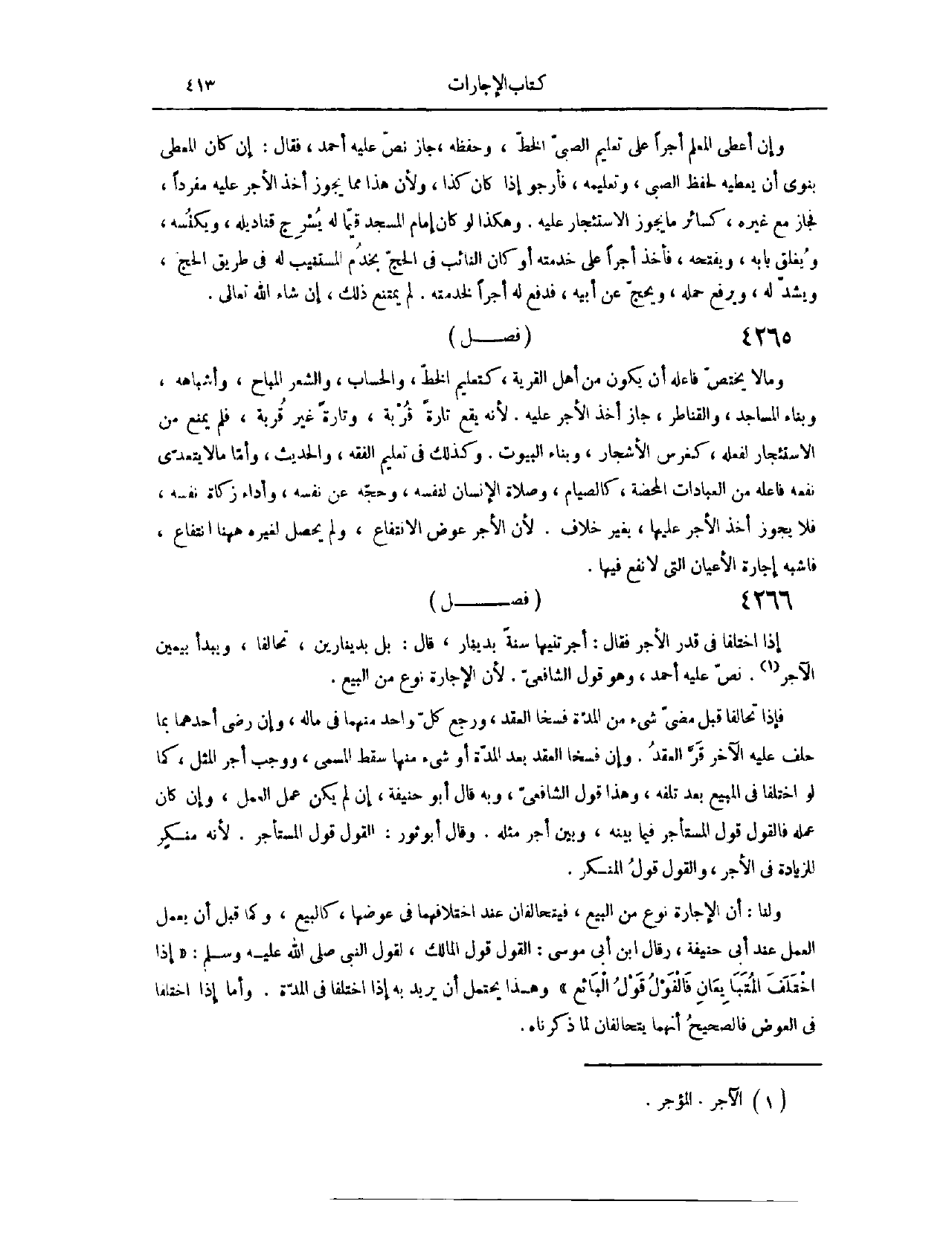 (٤٣٢٥) فَصْلٌ: وَمَا لَا يَخْتَصُّ فَاعِلُهُ أَنْ يَكُونَ مِنْ أَهْلِ الْقُرْبَةِ، كَتَعْلِيمِ الْخَطِّ وَالْحِسَابِ وَالشِّعْرِ الْمُبَاحِ، وَأَشْبَاهِهِ، وَبِنَاءِ الْمَسَاجِدِ وَالْقَنَاطِرِ، جَازَ أَخْذُ الْأَجْرِ عَلَيْهِ؛ لِأَنَّهُ يَقَعُ تَارَةً قُرْبَةً، وَتَارَةً غَيْرَ قُرْبَةٍ، فَلَمْ يُمْنَعْ مِنْ الِاسْتِئْجَارِ لِفِعْلِهِ، كَغَرْسِ الْأَشْجَارِ، وَبِنَاءِ الْبُيُوتِ. وَكَذَلِكَ فِي تَعْلِيمِ الْفِقْهِ وَالْحَدِيثِ. وَأَمَّا مَا لَا يَتَعَدَّى نَفْعُهُ فَاعِلَهُ مِنْ الْعِبَادَات الْمَحْضَةِ، كَالصِّيَامِ، وَصَلَاةِ الْإِنْسَانِ لِنَفْسِهِ، وَحَجِّهِ عَنْ نَفْسِهِ، وَأَدَاءِ زَكَاةِ نَفْسِهِ، فَلَا يَجُوزُ أَخْذُ الْأَجْرِ عَلَيْهَا، بِغَيْرِ خِلَافٍ؛ لِأَنَّ الْأَجْرَ عِوَضُ الِانْتِفَاعِ، وَلَمْ يَحْصُلْ لِغَيْرِهِ هَاهُنَا انْتِفَاعٌ، فَأَشْبَهَ إجَارَةَ الْأَعْيَانِ الَّتِي لَا نَفْعَ فِيهَا.
