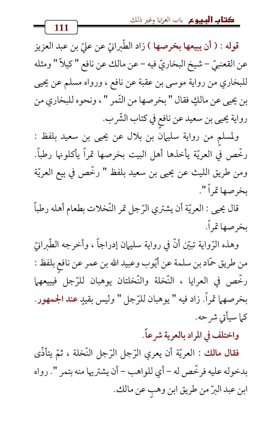 ولمسلمٍ من رواية سليمان بن بلال عن يحيى بن سعيد بلفظ: رخّص في العريّة يأخذها أهل البيت بخرصها تمراً يأكلونها رطباً. ومن طريق الليث عن يحيى بن سعيد بلفظ " رخّص في بيع العريّة بخرصها تمراً ".