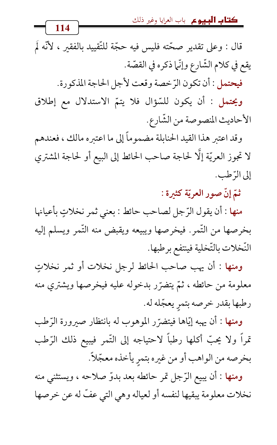 منها: أن يقول الرّجل لصاحب حائط: بعني ثمر نخلاتٍ بأعيانها بخرصها من التّمر. فيخرصها ويبيعه ويقبض منه التّمر ويسلم إليه النّخلات بالتّخلية فينتفع برطبها.