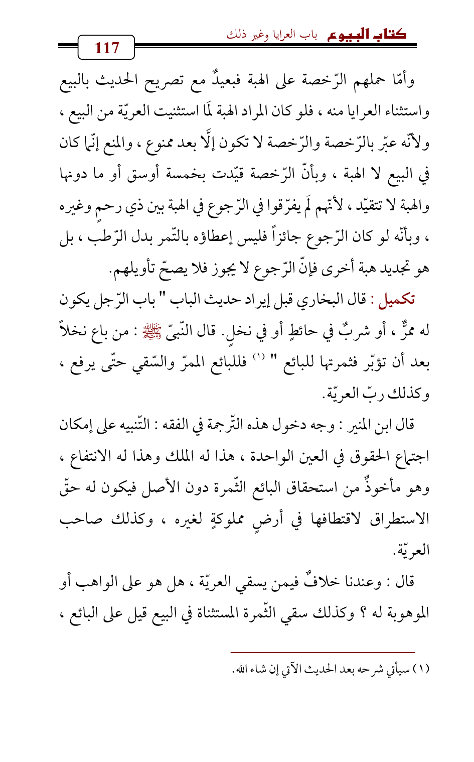 وأمّا حملهم الرّخصة على الهبة فبعيدٌ مع تصريح الحديث بالبيع واستثناء العرايا منه، فلو كان المراد الهبة لَمَا استثنيت العريّة من البيع، ولأنّه عبّر بالرّخصة والرّخصة لا تكون إلَّا بعد ممنوع , والمنع إنّما كان في البيع لا الهبة , وبأنّ الرّخصة قيّدت بخمسة أوسق أو ما دونها والهبة لا تتقيّد , لأنّهم لَم يفرّقوا في الرّجوع في الهبة بين ذي رحمٍ وغيره، وبأنّه لو كان الرّجوع جائزاً فليس إعطاؤه بالتّمر بدل الرّطب , بل هو تجديد هبة أخرى فإنّ الرّجوع لا يجوز فلا يصحّ تأويلهم.