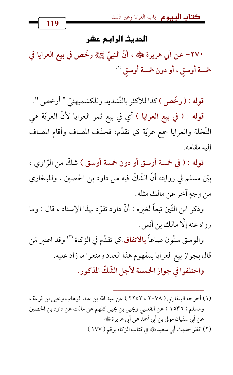 270 - عن أبي هريرة - رضي الله عنه - , أنّ النبيّ - صلى الله عليه وسلم - رخّص في بيع العرايا في خمسة أوسقٍ، أو دون خمسة أوسقٍ (¬1).