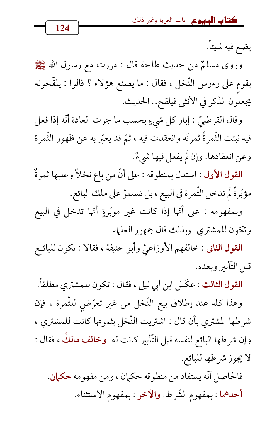 القول الأول: استدل بمنطوقه: على أنّ من باع نخلاً وعليها ثمرةٌ مؤبّرةٌ لَم تدخل الثّمرة في البيع , بل تستمرّ على ملك البائع.