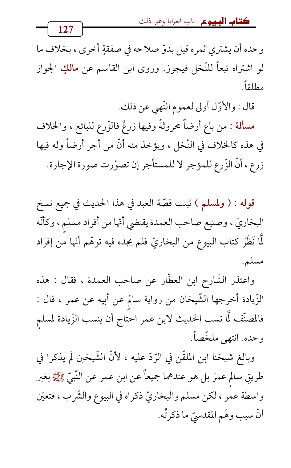 وبالغ شيخنا ابن الملقّن في الرّدّ عليه , لأنّ الشّيخين لَم يذكرا في طريقِ سالمٍ عمرَ بل هو عندهما جميعاً عن ابن عمر عن النّبيّ - صلى الله عليه وسلم - بغير واسطة عمر، لكن مسلم والبخاريّ ذكراه في البيوع والشّرب , فتعيّن أنّ سبب وهْم المقدسيّ ما ذكرتُه.