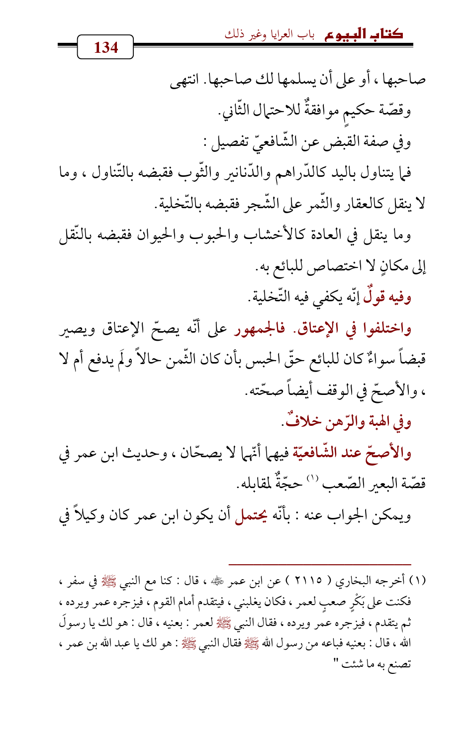(¬1) أخرجه البخاري (2115) عن ابن عمر - رضي الله عنه -، قال: كنا مع النبي - صلى الله عليه وسلم - في سفر، فكنت على بَكْرٍ صعبٍ لعمر، فكان يغلبني، فيتقدم أمام القوم، فيزجره عمر ويرده، ثم يتقدم، فيزجره عمر ويرده، فقال النبي - صلى الله عليه وسلم - لعمر: بعنيه، قال: هو لك يا رسولَ الله، قال: بعنيه فباعه من رسول الله - صلى الله عليه وسلم - فقال النبي - صلى الله عليه وسلم -: هو لك يا عبد الله بن عمر، تصنع به ما شئت "