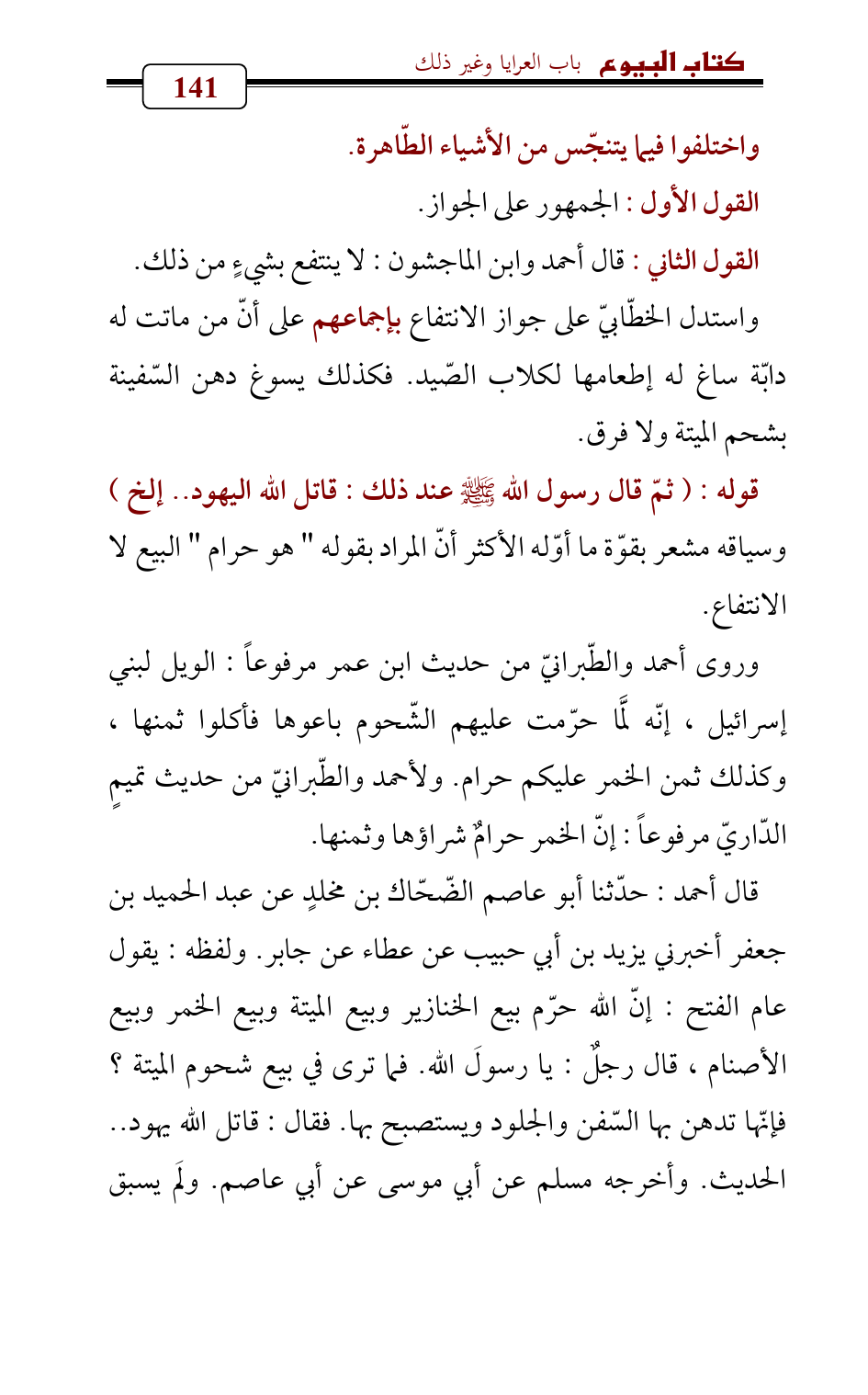 وروى أحمد والطّبرانيّ من حديث ابن عمر مرفوعاً: الويل لبني إسرائيل، إنّه لَمَّا حرّمت عليهم الشّحوم باعوها فأكلوا ثمنها، وكذلك ثمن الخمر عليكم حرام. ولأحمد والطّبرانيّ من حديث تميمٍ الدّاريّ مرفوعاً: إنّ الخمر حرامٌ شراؤها وثمنها.