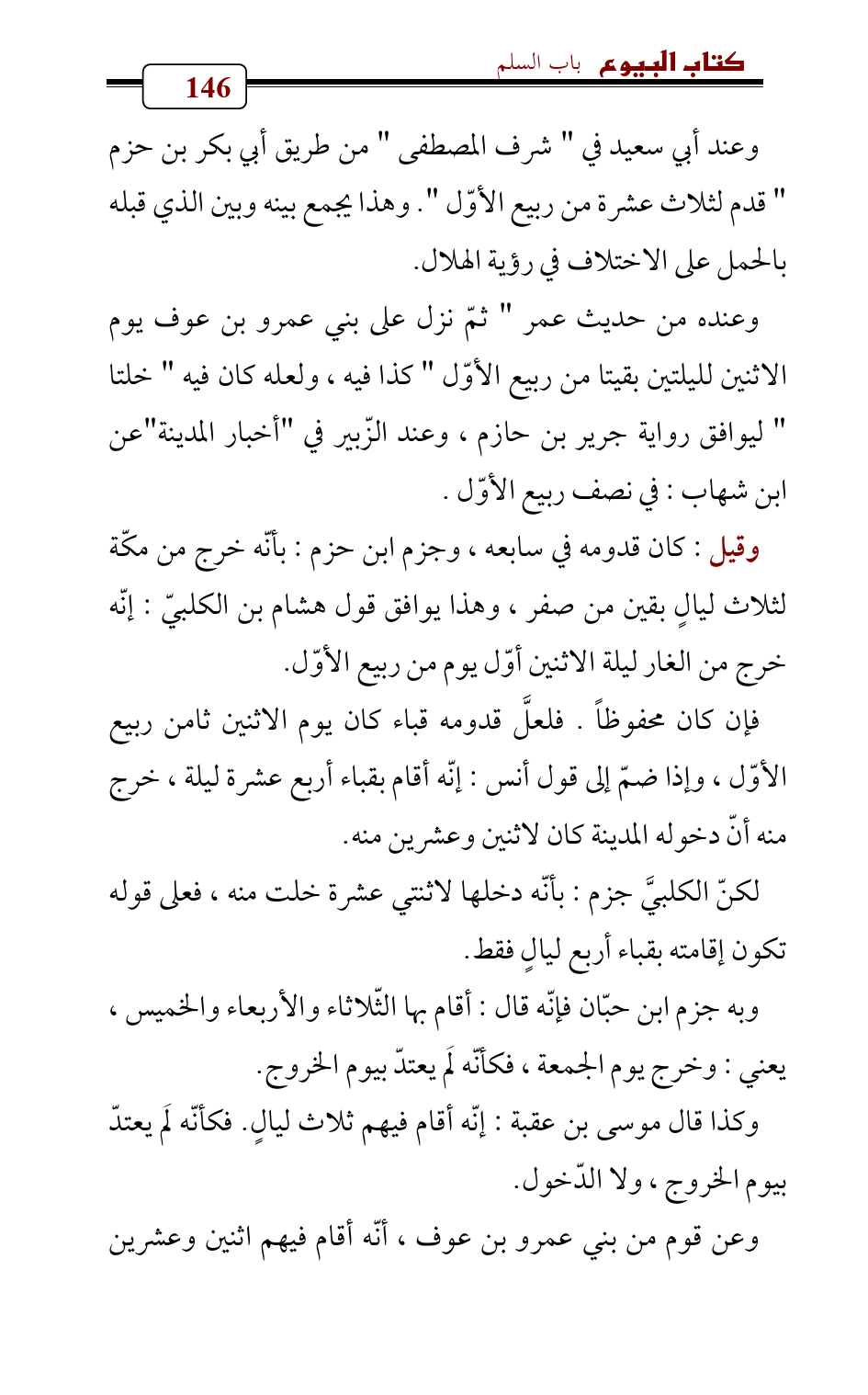 وقيل: كان قدومه في سابعه، وجزم ابن حزم: بأنّه خرج من مكّة لثلاث ليالٍ بقين من صفر، وهذا يوافق قول هشام بن الكلبيّ: إنّه خرج من الغار ليلة الاثنين أوّل يوم من ربيع الأوّل.