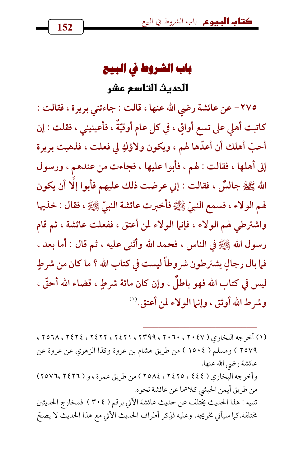 275 - عن عائشة رضي الله عنها، قالت: جاءتني بريرة، فقالت: كاتبت أهلي على تسع أواقٍ، في كل عام أوقيّةٌ، فأعينيني، فقلت: إن أحبّ أهلك أن أعدّها لهم، ويكون ولاؤكِ لي فعلت، فذهبت بريرة إلى أهلها، فقالت: لهم، فأبوا عليها، فجاءت من عندهم، ورسول الله - صلى الله عليه وسلم - جالسٌ، فقالت: إني عرضت ذلك عليهم فأبوا إلَّا أن يكون لهم الولاء، فسمع النبيّ - صلى الله عليه وسلم - فأخبرت عائشة النبيّ - صلى الله عليه وسلم - , فقال: خذيها واشترطي لهم الولاء، فإنما الولاء لمن أعتق، ففعلت عائشة، ثم قام رسول الله - صلى الله عليه وسلم - في الناس، فحمد الله وأثنى عليه، ثم قال: أما بعد، فما بال رجالٍ يشترطون شروطاً ليست في كتاب الله؟ ما كان من شرطٍ ليس في كتاب الله فهو باطلٌ، وإن كان مائة شرطٍ، قضاء الله أحقّ، وشرط الله أوثق، وإنما الولاء لمن أعتق. (¬1)