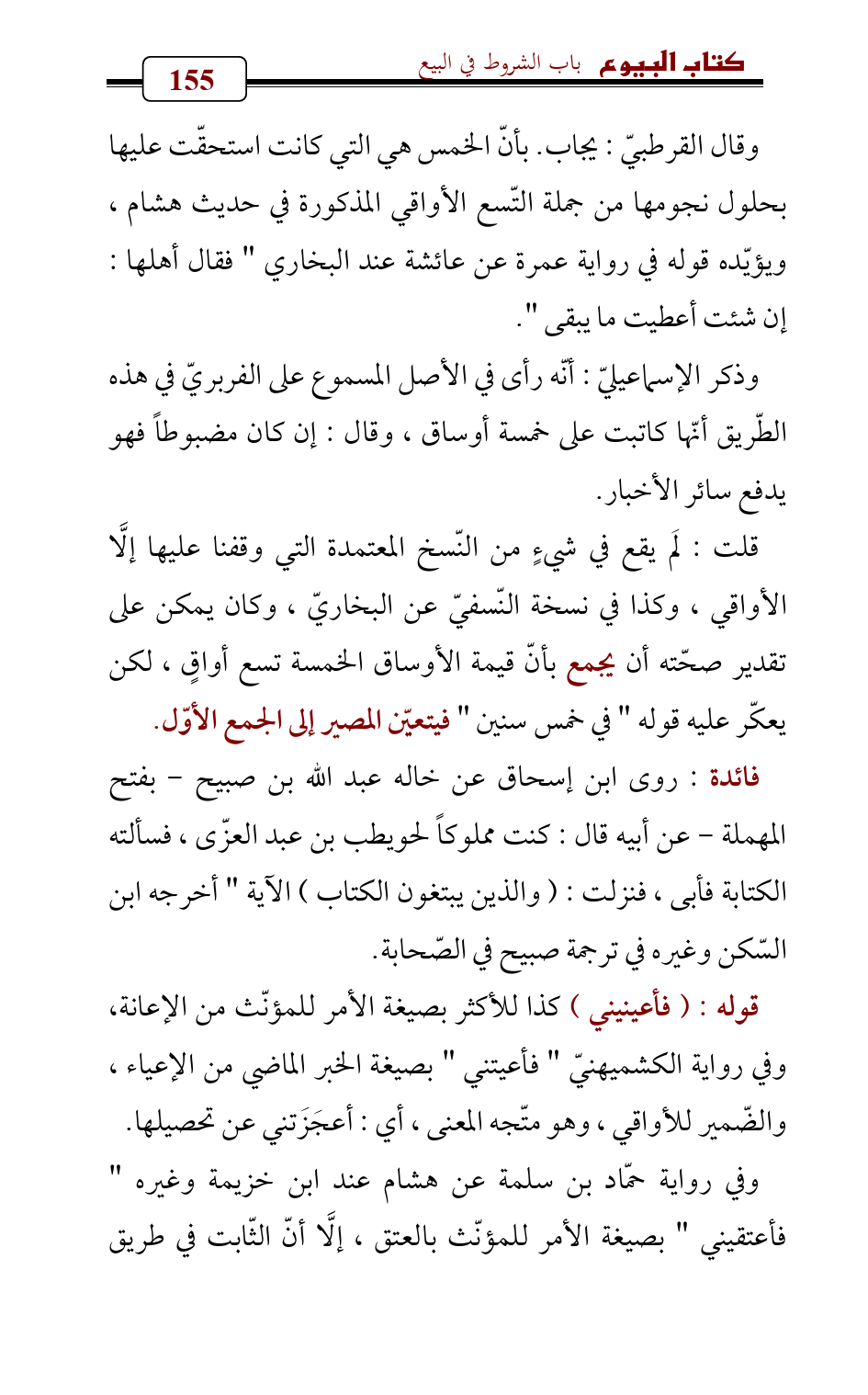 وقال القرطبيّ: يجاب. بأنّ الخمس هي التي كانت استحقّت عليها بحلول نجومها من جملة التّسع الأواقي المذكورة في حديث هشام، ويؤيّده قوله في رواية عمرة عن عائشة عند البخاري " فقال أهلها: إن شئت أعطيت ما يبقى ".