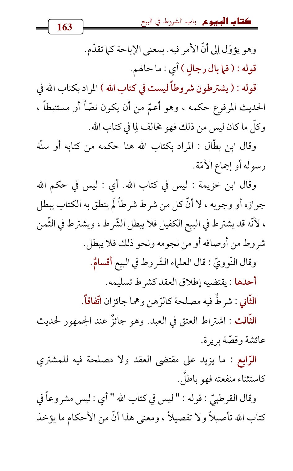 وقال ابن خزيمة: ليس في كتاب الله. أي: ليس في حكم الله جوازه أو وجوبه، لا أنّ كل من شرط شرطاً لَم ينطق به الكتاب يبطل، لأنّه قد يشترط في البيع الكفيل فلا يبطل الشّرط، ويشترط في الثّمن شروط من أوصافه أو من نجومه ونحو ذلك فلا يبطل.