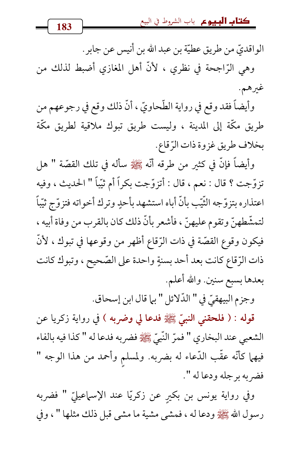 وأيضاً فإنّ في كثير من طرقه أنّه - صلى الله عليه وسلم - سأله في تلك القصّة " هل تزوّجت؟ قال: نعم، قال: أتزوّجت بكراً أم ثيّباً " الحديث، وفيه اعتذاره بتزوّجه الثّيّب بأنّ أباه استشهد بأحدٍ وترك أخواته فتزوّج ثيّباً لتمشّطهنّ وتقوم عليهنّ، فأشعر بأنّ ذلك كان بالقرب من وفاة أبيه، فيكون وقوع القصّة في ذات الرّقاع أظهر من وقوعها في تبوك، لأنّ ذات الرّقاع كانت بعد أحد بسنةٍ واحدة على الصّحيح، وتبوك كانت بعدها بسبع سنين. والله أعلم.