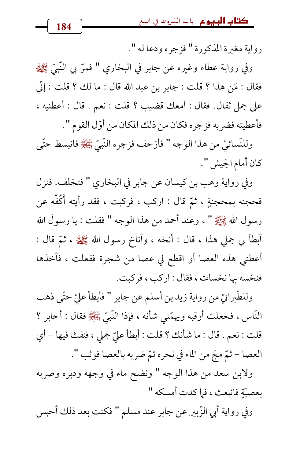 وفي رواية وهب بن كيسان عن جابر في البخاري " فتخلف. فنزل فحجنه بمحجنةٍ , ثمّ قال: اركب، فركبت، فقد رأيته أَكُفّه عن رسول الله - صلى الله عليه وسلم - " , وعند أحمد من هذا الوجه " فقلت: يا رسولَ الله أبطأ بي جملي هذا، قال: أنخه، وأناخ رسول الله - صلى الله عليه وسلم -، ثمّ قال: أعطني هذه العصا أو اقطع لي عصا من شجرة ففعلت، فأخذها فنخسه بها نخسات , فقال: اركب، فركبت.