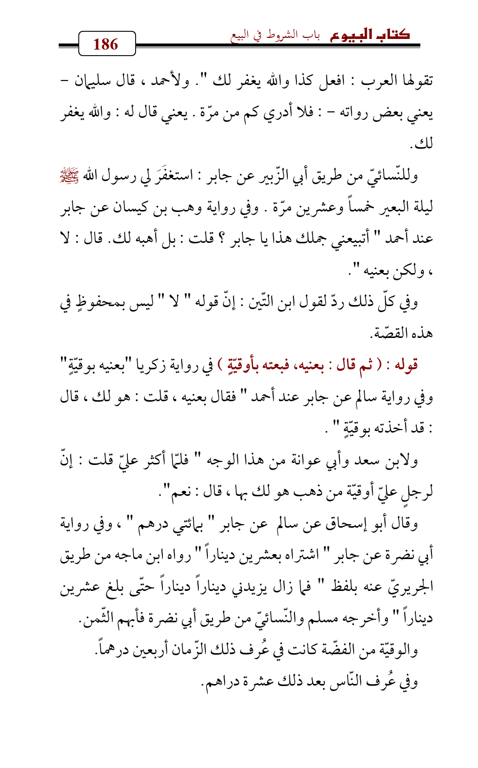 قوله: (ثم قال: بعنيه، فبعته بأوقيّةٍ) في رواية زكريا " بعنيه بوقيّةٍ " وفي رواية سالم عن جابر عند أحمد " فقال بعنيه، قلت: هو لك، قال: قد أخذته بوقيّةٍ ".