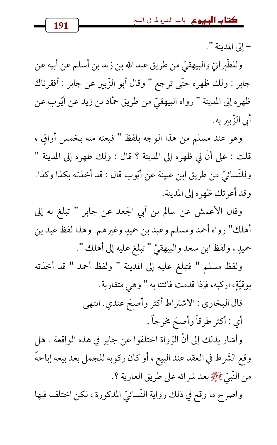 وللطّبرانيّ والبيهقيّ من طريق عبد الله بن زيد بن أسلم عن أبيه عن جابر: ولك ظهره حتّى ترجع " وقال أبو الزّبير عن جابر: أفقرناك ظهره إلى المدينة " رواه البيهقيّ من طريق حمّاد بن زيد عن أيّوب عن أبي الزّبير به.