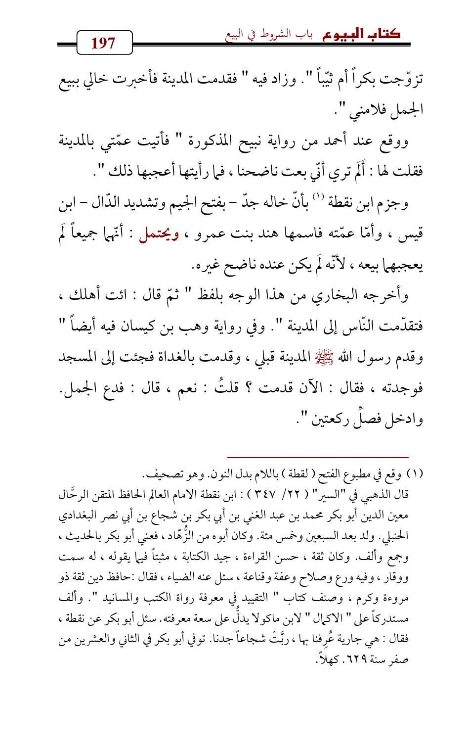 تزوّجت بكراً أم ثيّباً ". وزاد فيه " فقدمت المدينة فأخبرت خالي ببيع الجمل فلامني ".