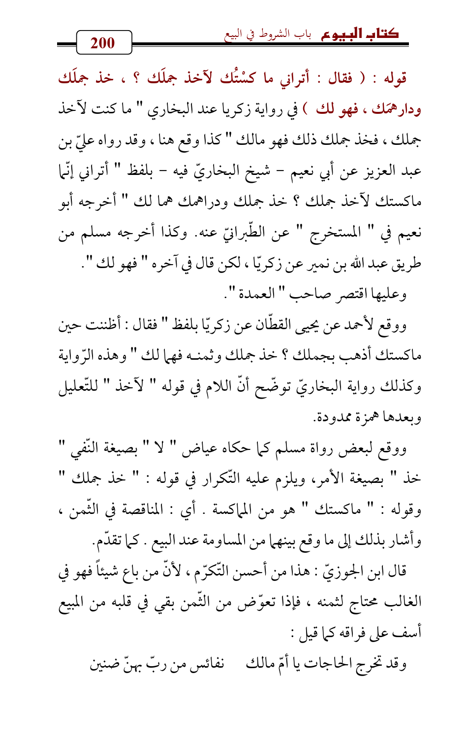 قوله: (فقال: أتراني ما كسْتُك لآخذ جملَك؟، خذ جملَك ودارهمَك، فهو لك) في رواية زكريا عند البخاري " ما كنت لآخذ جملك، فخذ جملك ذلك فهو مالك " كذا وقع هنا، وقد رواه عليّ بن عبد العزيز عن أبي نعيم - شيخ البخاريّ فيه - بلفظ " أتراني إنّما ماكستك لآخذ جملك؟ خذ جملك ودراهمك هما لك " أخرجه أبو نعيم في " المستخرج " عن الطّبرانيّ عنه. وكذا أخرجه مسلم من طريق عبد الله بن نمير عن زكريّا، لكن قال في آخره " فهو لك ".