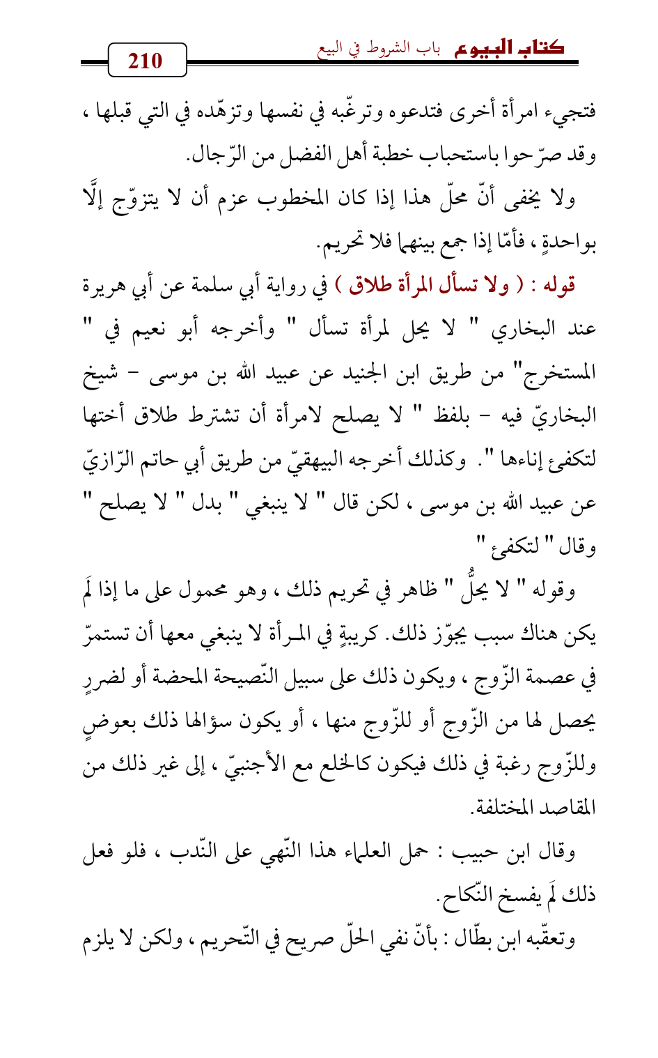 قوله: (ولا تسأل المرأة طلاق) في رواية أبي سلمة عن أبي هريرة عند البخاري " لا يحل لمرأة تسأل " وأخرجه أبو نعيم في " المستخرج " من طريق ابن الجنيد عن عبيد الله بن موسى - شيخ البخاريّ فيه - بلفظ " لا يصلح لامرأة أن تشترط طلاق أختها لتكفئ إناءها ". وكذلك أخرجه البيهقيّ من طريق أبي حاتم الرّازيّ عن عبيد الله بن موسى , لكن قال " لا ينبغي " بدل " لا يصلح " وقال " لتكفئ "