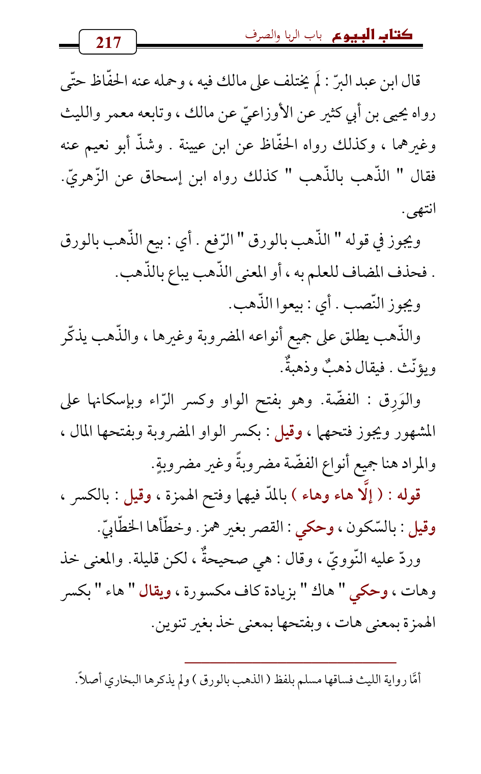 قال ابن عبد البرّ: لَم يختلف على مالك فيه , وحمله عنه الحفّاظ حتّى رواه يحيى بن أبي كثير عن الأوزاعيّ عن مالك، وتابعه معمر والليث وغيرهما، وكذلك رواه الحفّاظ عن ابن عيينة. وشذّ أبو نعيم عنه فقال " الذّهب بالذّهب " كذلك رواه ابن إسحاق عن الزّهريّ. انتهى.