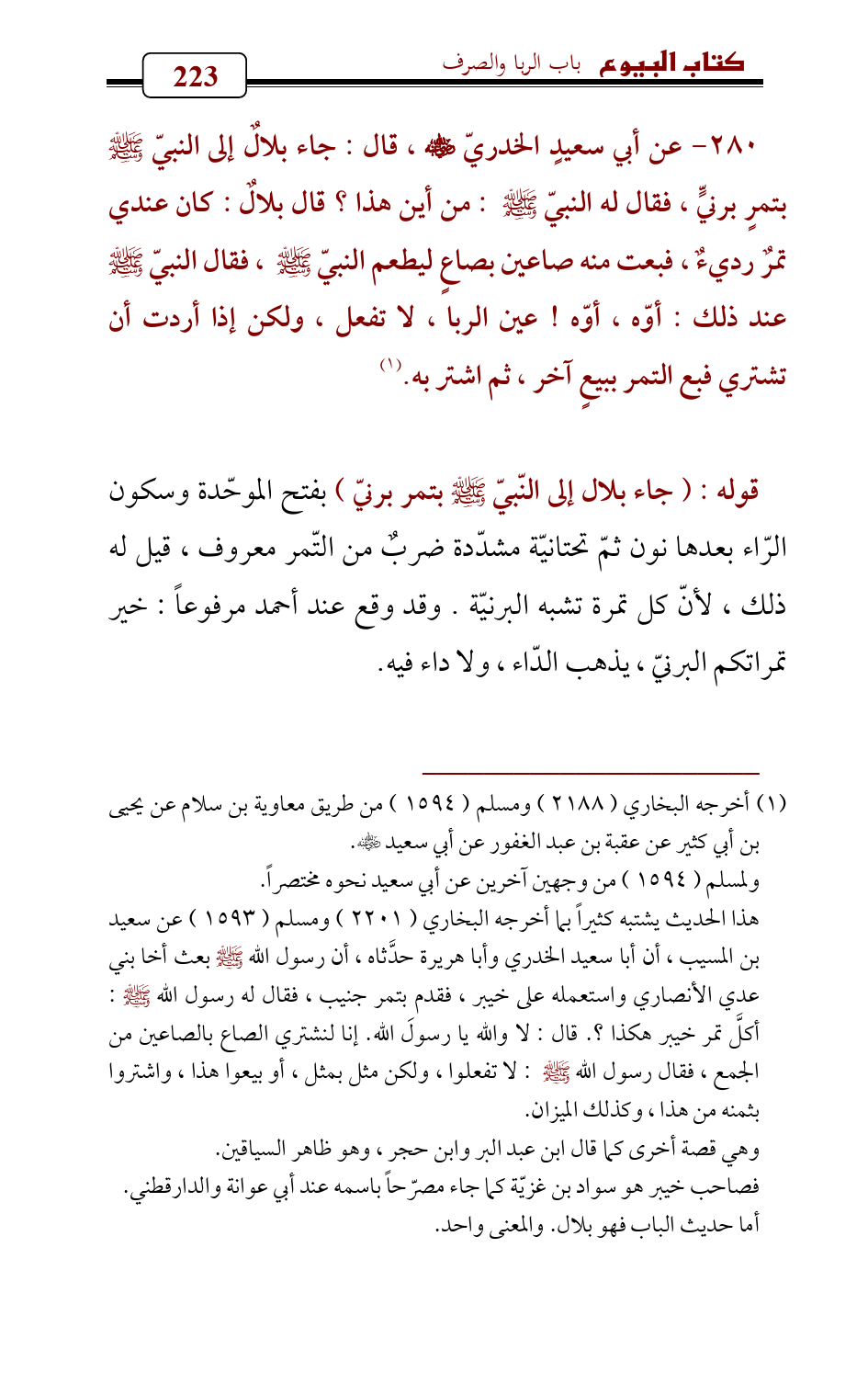 280 - عن أبي سعيدٍ الخدريّ - رضي الله عنه - , قال: جاء بلالٌ إلى النبيّ - صلى الله عليه وسلم - بتمرٍ برنيٍّ، فقال له النبيّ - صلى الله عليه وسلم -: من أين هذا؟ قال بلالٌ: كان عندي تمرٌ رديءٌ، فبعت منه صاعين بصاعٍ ليطعم النبيّ - صلى الله عليه وسلم - , فقال النبيّ - صلى الله عليه وسلم - عند ذلك: أوّه، أوّه! عين الربا، لا تفعل، ولكن إذا أردت أن تشتري فبع التمر ببيعٍ آخر، ثم اشتر به. (¬1)