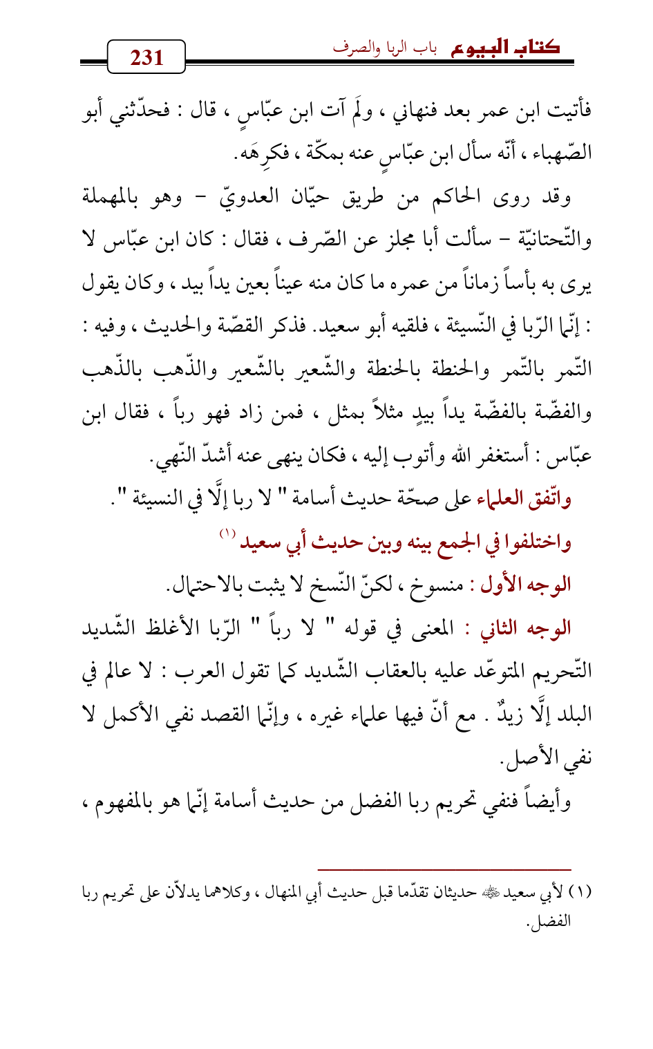 وقد روى الحاكم من طريق حيّان العدويّ - وهو بالمهملة والتّحتانيّة - سألت أبا مجلز عن الصّرف , فقال: كان ابن عبّاس لا يرى به بأساً زماناً من عمره ما كان منه عيناً بعين يداً بيد، وكان يقول: إنّما الرّبا في النّسيئة , فلقيه أبو سعيد. فذكر القصّة والحديث، وفيه: التّمر بالتّمر والحنطة بالحنطة والشّعير بالشّعير والذّهب بالذّهب والفضّة بالفضّة يداً بيدٍ مثلاً بمثل، فمن زاد فهو رباً، فقال ابن عبّاس: أستغفر الله وأتوب إليه، فكان ينهى عنه أشدّ النّهي.