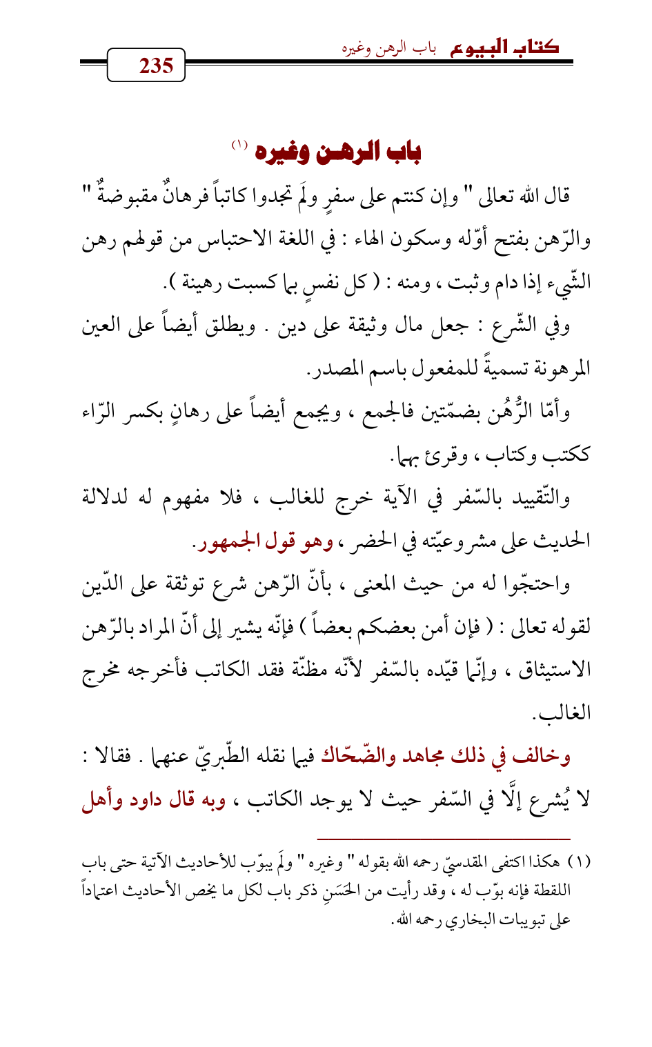 واحتجّوا له من حيث المعنى , بأنّ الرّهن شرع توثقة على الدّين لقوله تعالى: (فإن أمن بعضكم بعضاً) فإنّه يشير إلى أنّ المراد بالرّهن الاستيثاق، وإنّما قيّده بالسّفر لأنّه مظنّة فقد الكاتب فأخرجه مخرج الغالب.
