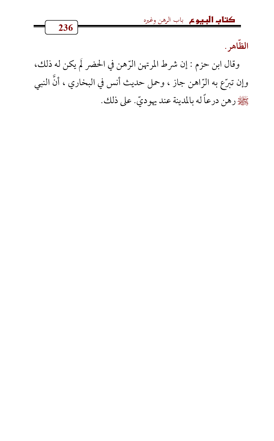 وقال ابن حزم: إن شرط المرتهن الرّهن في الحضر لَم يكن له ذلك، وإن تبرّع به الرّاهن جاز، وحمل حديث أنس في البخاري , أنَّ النبي - صلى الله عليه وسلم - رهن درعاً له بالمدينة عند يهوديّ. على ذلك.