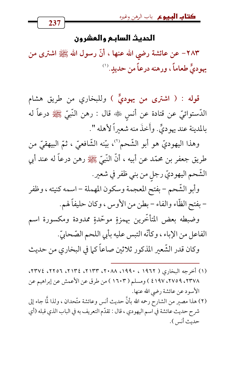 وهذا اليهوديّ هو أبو الشّحم (¬2)، بيّنه الشّافعيّ , ثمّ البيهقيّ من طريق جعفر بن محمّد عن أبيه , أنّ النّبيّ - صلى الله عليه وسلم - رهن درعاً له عند أبي الشّحم اليهوديّ رجلٍ من بني ظفر في شعير.