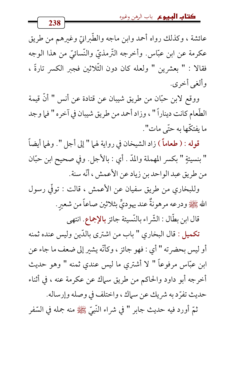 وللبخاري من طريق سفيان عن الأعمش , قالت: توفّي رسول الله - صلى الله عليه وسلم - ودرعه مرهونةٌ عند يهوديٍّ بثلاثين صاعاً من شعيرٍ.