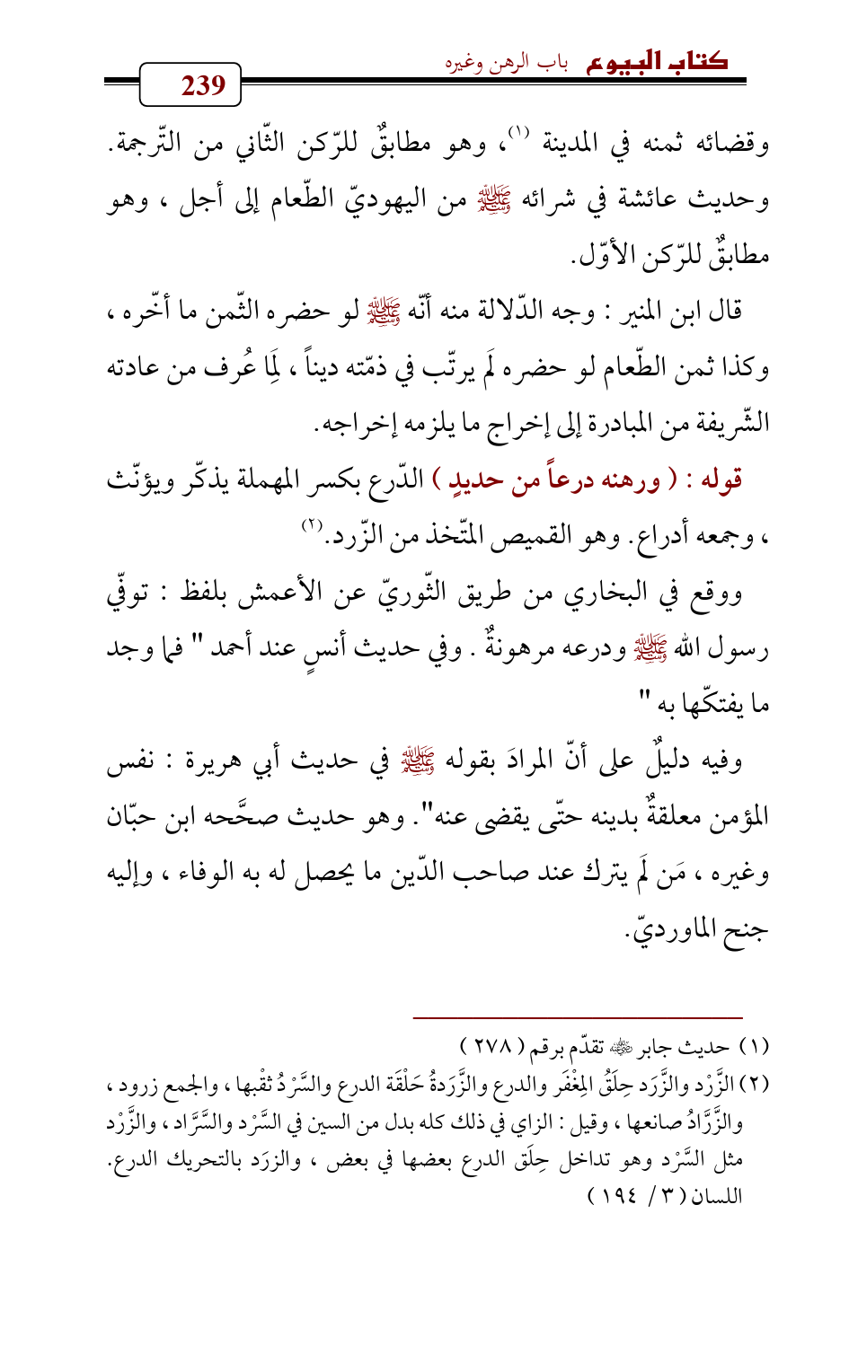 قوله: (ورهنه درعاً من حديدٍ) الدّرع بكسر المهملة يذكّر ويؤنّث , وجمعه أدراع. وهو القميص المتّخذ من الزّرد. (¬2)