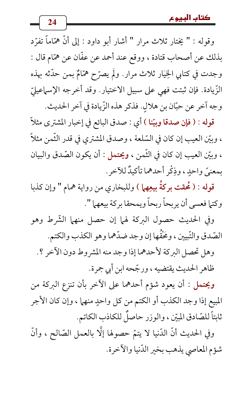 وقوله: " يختار ثلاث مرار " أشار أبو داود: إلى أنّ همّاماً تفرّد بذلك عن أصحاب قتادة، ووقع عند أحمد عن عفّان عن همّام قال: وجدت في كتابي الخِيَار ثلاث مرار. ولَم يصرّح همّامٌ بمن حدّثه بهذه الزّيادة. فإن ثبتت فهي على سبيل الاختيار. وقد أخرجه الإسماعيليّ وجه آخر عن حبّان بن هلالٍ. فذكر هذه الزّيادة في آخر الحديث.