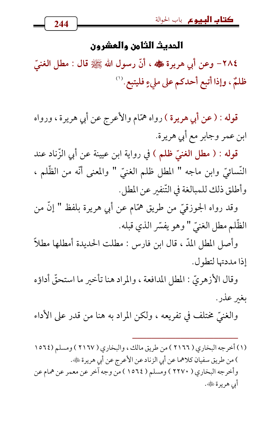 284 - وعن أبي هريرة - رضي الله عنه - , أنّ رسول الله - صلى الله عليه وسلم - قال: مطل الغنيّ ظلمٌ، وإذا أتبع أحدكم على مليءٍ فليتبع. (¬1)
