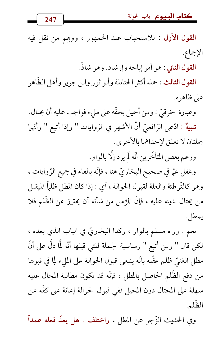 وغفل عمّا في صحيح البخاريّ هنا , فإنّه بالفاء في جميع الرّوايات، وهو كالتّوطئة والعلة لقبول الحوالة، أي: إذا كان المطل ظلماً فليقبل من يحتال بدينه عليه، فإنّ المؤمن من شأنه أن يحترز عن الظّلم فلا يمطل.
