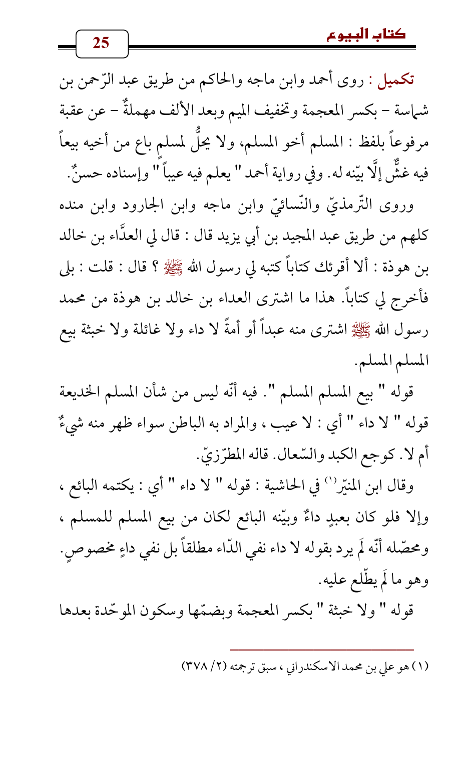 وروى التّرمذيّ والنّسائيّ وابن ماجه وابن الجارود وابن منده كلهم من طريق عبد المجيد بن أبي يزيد قال: قال لي العدَّاء بن خالد بن هوذة: ألا أقرئك كتاباً كتبه لي رسول الله - صلى الله عليه وسلم -؟ قال: قلت: بلى فأخرج لي كتاباً. هذا ما اشترى العداء بن خالد بن هوذة من محمد رسول الله - صلى الله عليه وسلم - اشترى منه عبداً أو أمةً لا داء ولا غائلة ولا خبثة بيع المسلم المسلم.