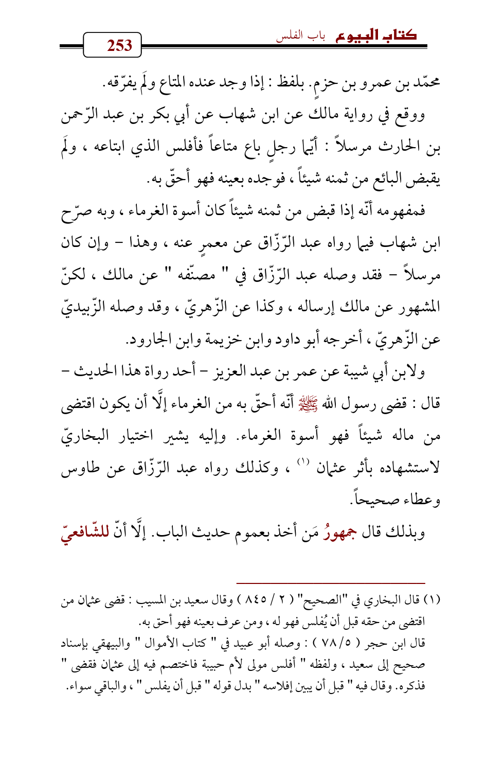 (¬1) قال البخاري في " الصحيح " (2/ 845) وقال سعيد بن المسيب: قضى عثمان من اقتضى من حقه قبل أن يُفلس فهو له , ومن عرف بعينه فهو أحق به.