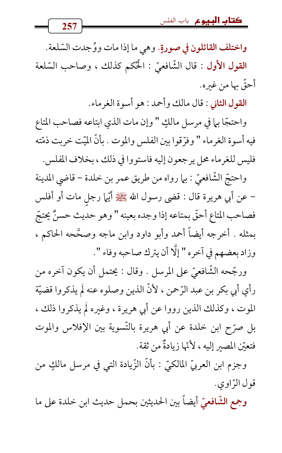 ورجّحه الشّافعيّ على المرسل. وقال: يحتمل أن يكون آخره من رأي أبي بكر بن عبد الرّحمن , لأنّ الذين وصلوه عنه لَم يذكروا قضيّة الموت، وكذلك الذين رووا عن أبي هريرة , وغيره لَم يذكروا ذلك، بل صرّح ابن خلدة عن أبي هريرة بالتّسوية بين الإفلاس والموت فتعيّن المصير إليه , لأنّها زيادةٌ من ثقة.