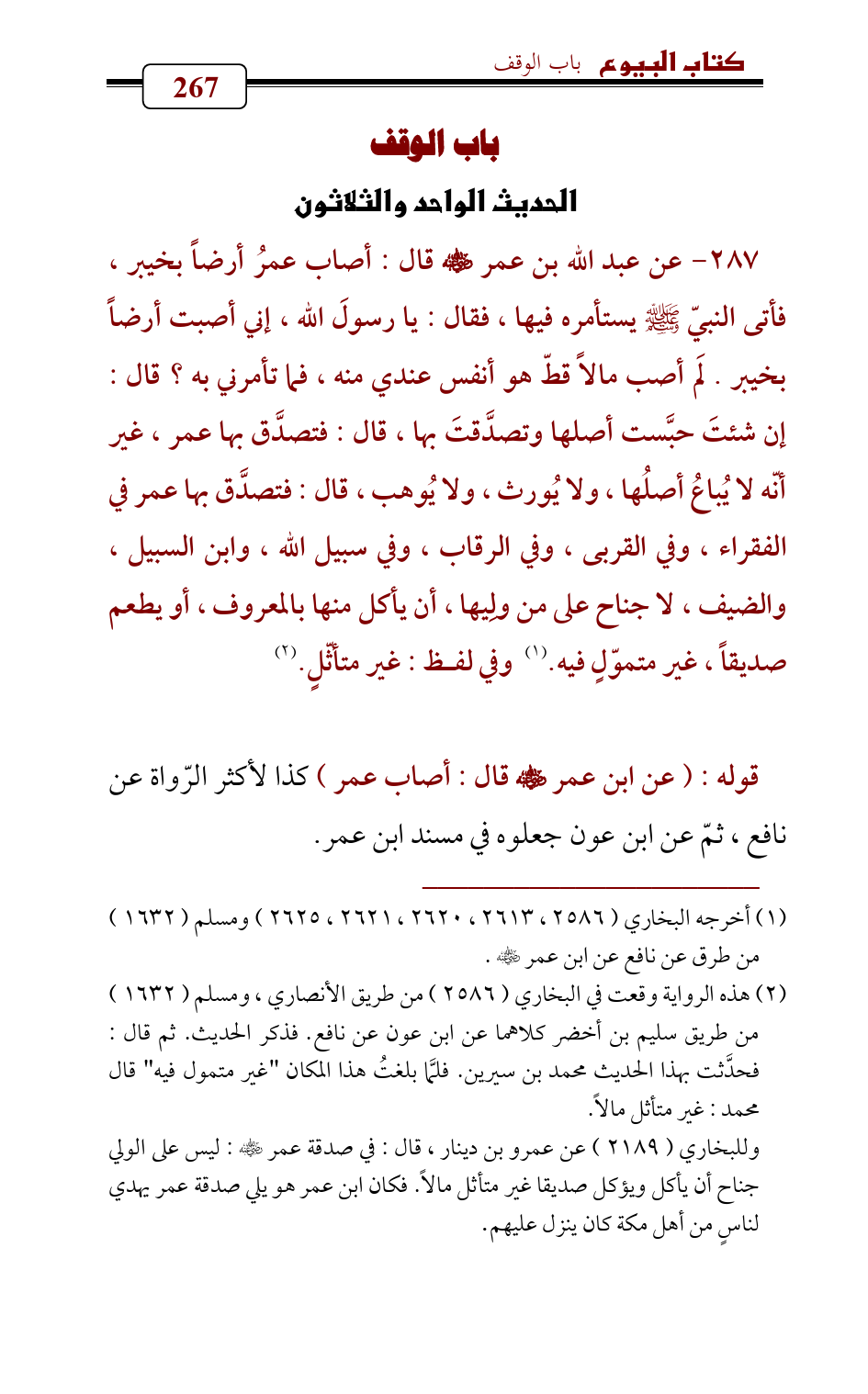 287 - عن عبد الله بن عمر - رضي الله عنه - قال: أصاب عمرُ أرضاً بخيبر، فأتى النبيّ - صلى الله عليه وسلم - يستأمره فيها، فقال: يا رسولَ الله، إني أصبت أرضاً بخيبر. لَم أصب مالاً قطّ هو أنفس عندي منه، فما تأمرني به؟ قال: إن شئتَ حبَّست أصلها وتصدَّقتَ بها، قال: فتصدَّق بها عمر، غير أنّه لا يُباعُ أصلُها، ولا يُورث، ولا يُوهب، قال: فتصدَّق بها عمر في الفقراء، وفي القربى، وفي الرقاب، وفي سبيل الله، وابن السبيل، والضيف، لا جناح على من ولِيها، أن يأكل منها بالمعروف، أو يطعم صديقاً، غير متموّلٍ فيه. (¬1) وفي لفظ: غير متأثّلٍ. (¬2)