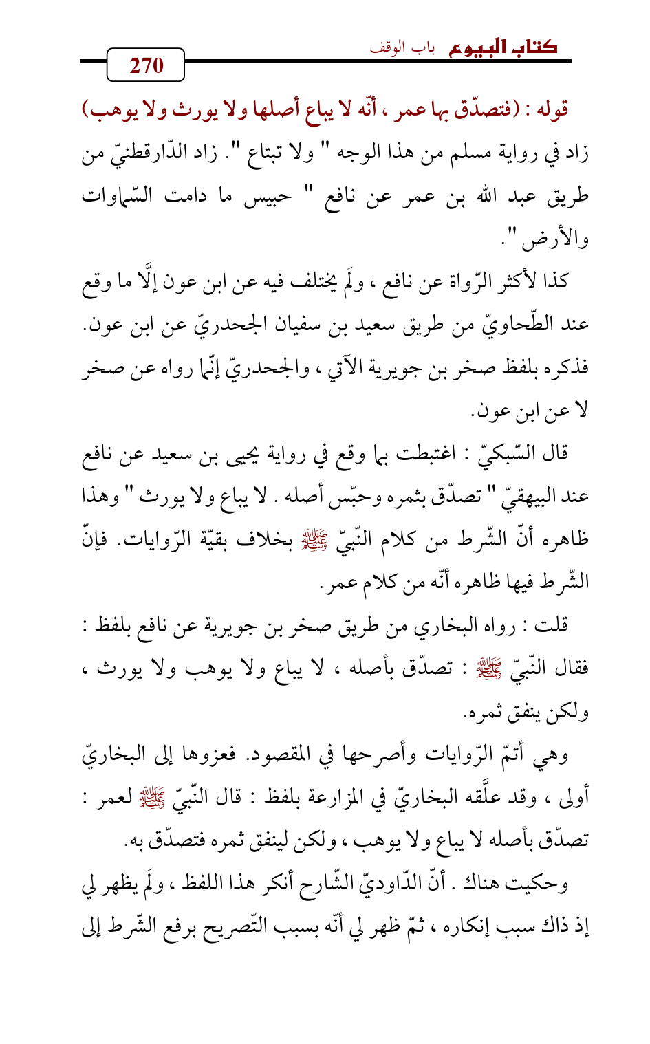 قال السّبكيّ: اغتبطت بما وقع في رواية يحيى بن سعيد عن نافع عند البيهقيّ " تصدّق بثمره وحبّس أصله. لا يباع ولا يورث " وهذا ظاهره أنّ الشّرط من كلام النّبيّ - صلى الله عليه وسلم - بخلاف بقيّة الرّوايات. فإنّ الشّرط فيها ظاهره أنّه من كلام عمر.