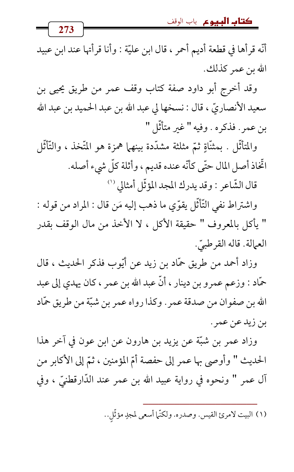 وقد أخرج أبو داود صفة كتاب وقف عمر من طريق يحيى بن سعيد الأنصاريّ , قال: نسخها لي عبد الله بن عبد الحميد بن عبد الله بن عمر. فذكره. وفيه " غير متأثّل "