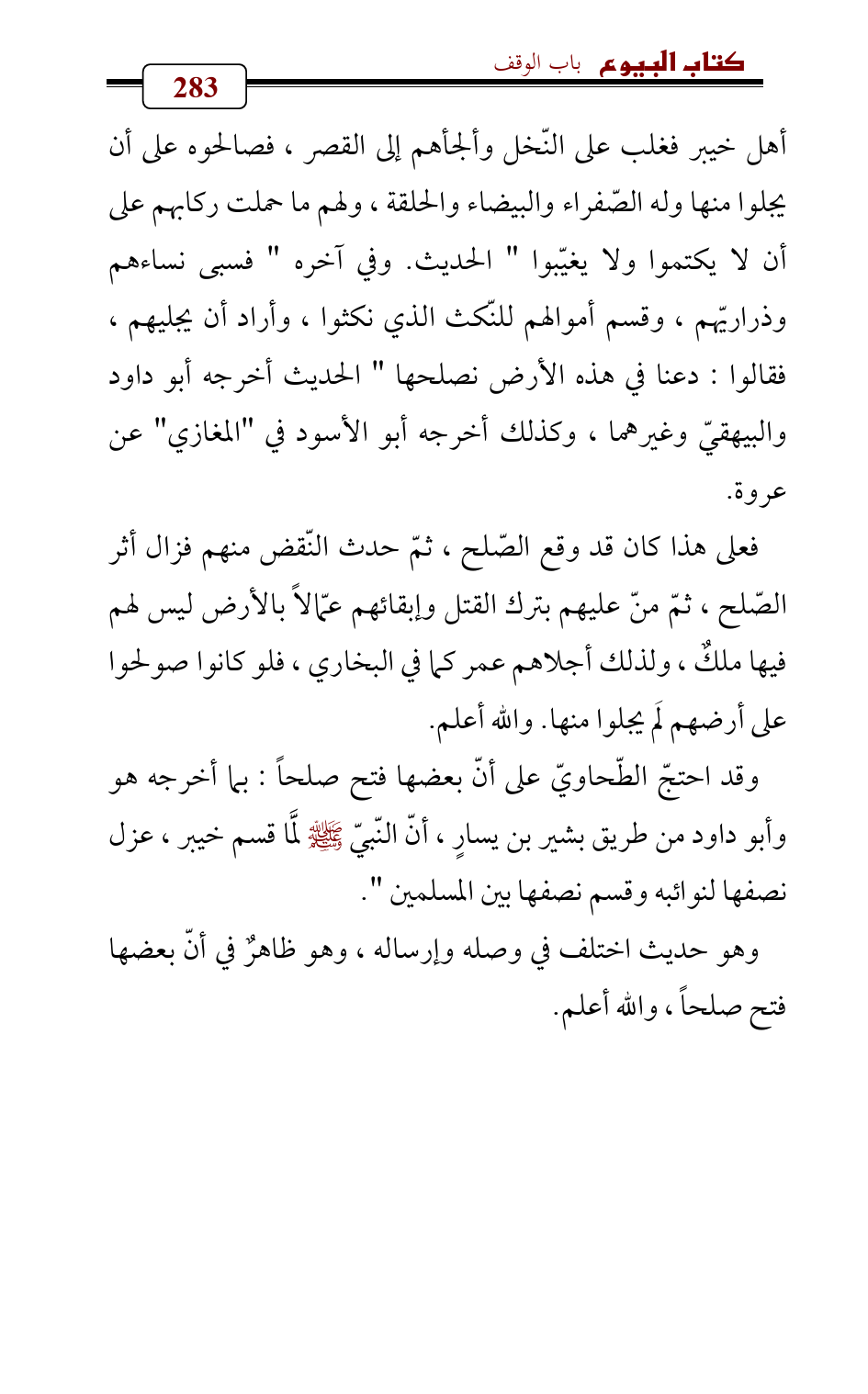 أهل خيبر فغلب على النّخل وألجأهم إلى القصر , فصالحوه على أن يجلوا منها وله الصّفراء والبيضاء والحلقة , ولهم ما حملت ركابهم على أن لا يكتموا ولا يغيّبوا " الحديث. وفي آخره " فسبى نساءهم وذراريّهم، وقسم أموالهم للنّكث الذي نكثوا، وأراد أن يجليهم , فقالوا: دعنا في هذه الأرض نصلحها " الحديث أخرجه أبو داود والبيهقيّ وغيرهما، وكذلك أخرجه أبو الأسود في " المغازي " عن عروة.