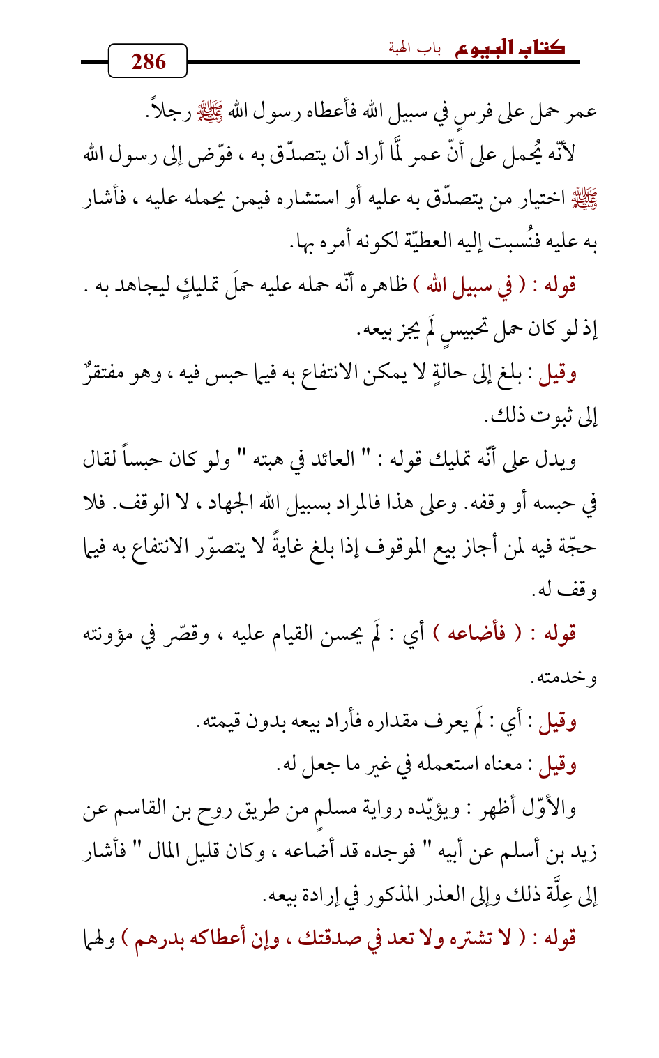 ويدل على أنّه تمليك قوله: " العائد في هبته " ولو كان حبساً لقال في حبسه أو وقفه. وعلى هذا فالمراد بسبيل الله الجهاد , لا الوقف. فلا حجّة فيه لمن أجاز بيع الموقوف إذا بلغ غايةً لا يتصوّر الانتفاع به فيما وقف له.