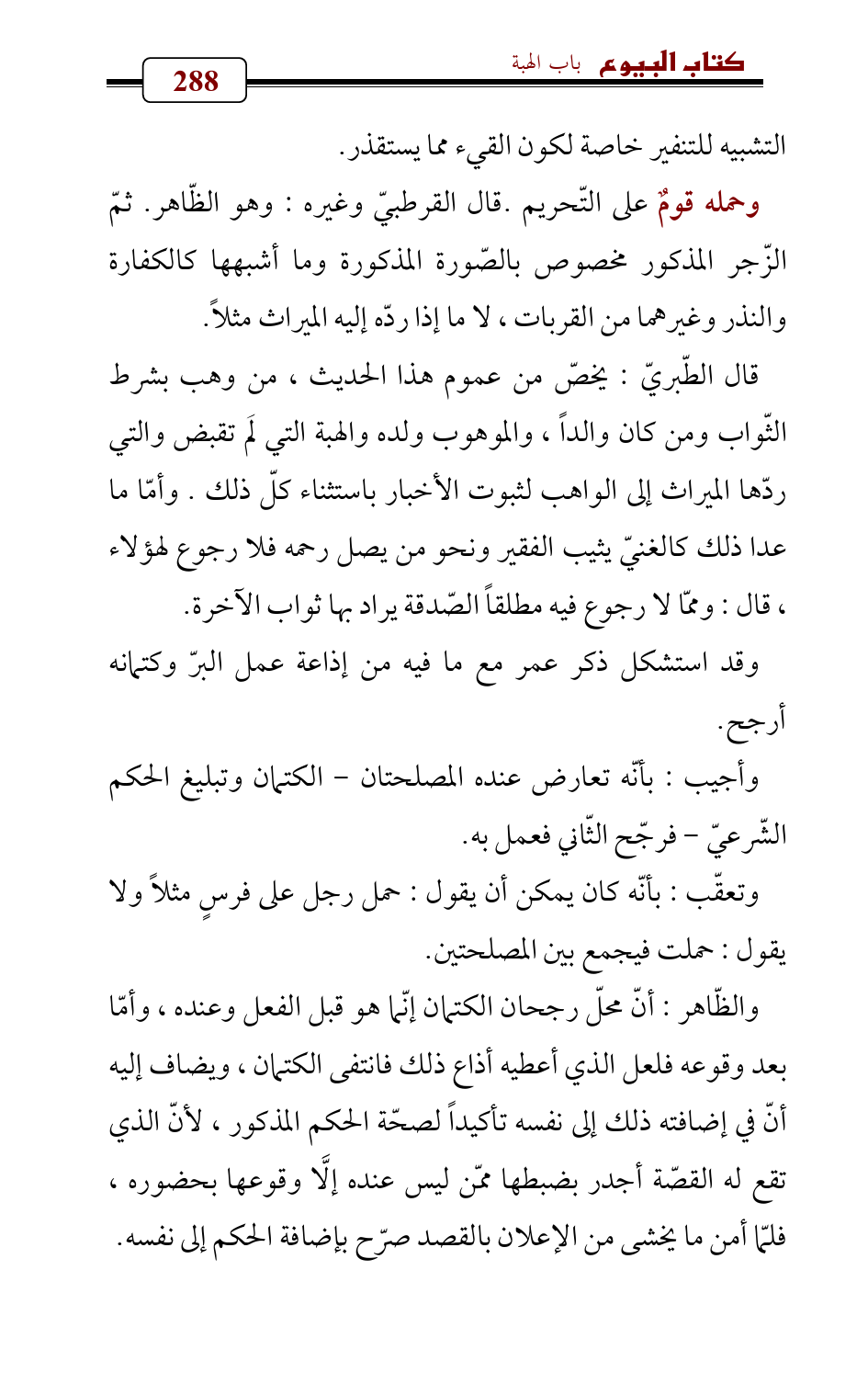قال الطّبريّ: يخصّ من عموم هذا الحديث , من وهب بشرط الثّواب ومن كان والداً، والموهوب ولده والهبة التي لَم تقبض والتي ردّها الميراث إلى الواهب لثبوت الأخبار باستثناء كلّ ذلك. وأمّا ما عدا ذلك كالغنيّ يثيب الفقير ونحو من يصل رحمه فلا رجوع لهؤلاء , قال: وممّا لا رجوع فيه مطلقاً الصّدقة يراد بها ثواب الآخرة.