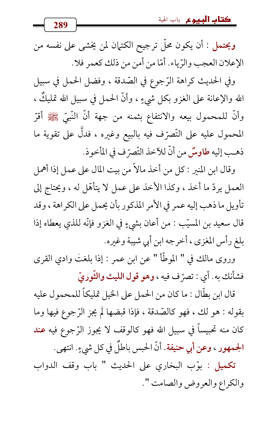 قال ابن بطّال: ما كان من الحمل على الخيل تمليكاً للمحمول عليه بقوله: هو لك , فهو كالصّدقة، فإذا قبضها لَم يجز الرّجوع فيها وما كان منه تحبيساً في سبيل الله فهو كالوقف لا يجوز الرّجوع فيه عند الجمهور، وعن أبي حنيفة. أنّ الحبس باطلٌ في كل شيءٍ. انتهى.