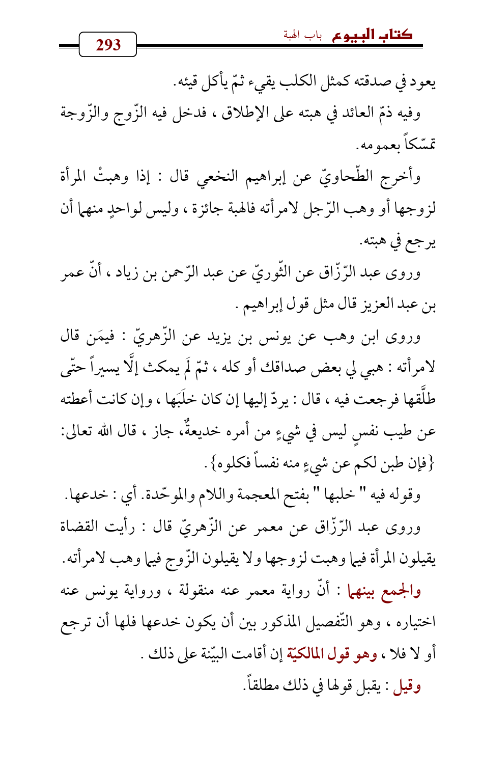 وروى ابن وهب عن يونس بن يزيد عن الزّهريّ: فيمَن قال لامرأته: هبي لي بعض صداقك أو كله، ثمّ لَم يمكث إلَّا يسيراً حتّى طلَّقها فرجعت فيه، قال: يردّ إليها إن كان خلَبَها، وإن كانت أعطته عن طيب نفسٍ ليس في شيءٍ من أمره خديعةٌ، جاز , قال الله تعالى: {فإن طبن لكم عن شيءٍ منه نفساً فكلوه}.