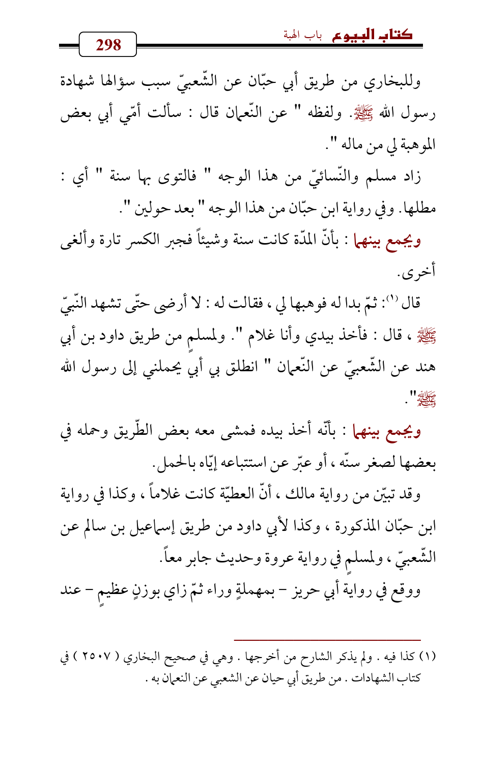 قال (¬1): ثمّ بدا له فوهبها لي، فقالت له: لا أرضى حتّى تشهد النّبيّ - صلى الله عليه وسلم -، قال: فأخذ بيدي وأنا غلام ". ولمسلمٍ من طريق داود بن أبي هند عن الشّعبيّ عن النّعمان " انطلق بي أبي يحملني إلى رسول الله - صلى الله عليه وسلم - ".