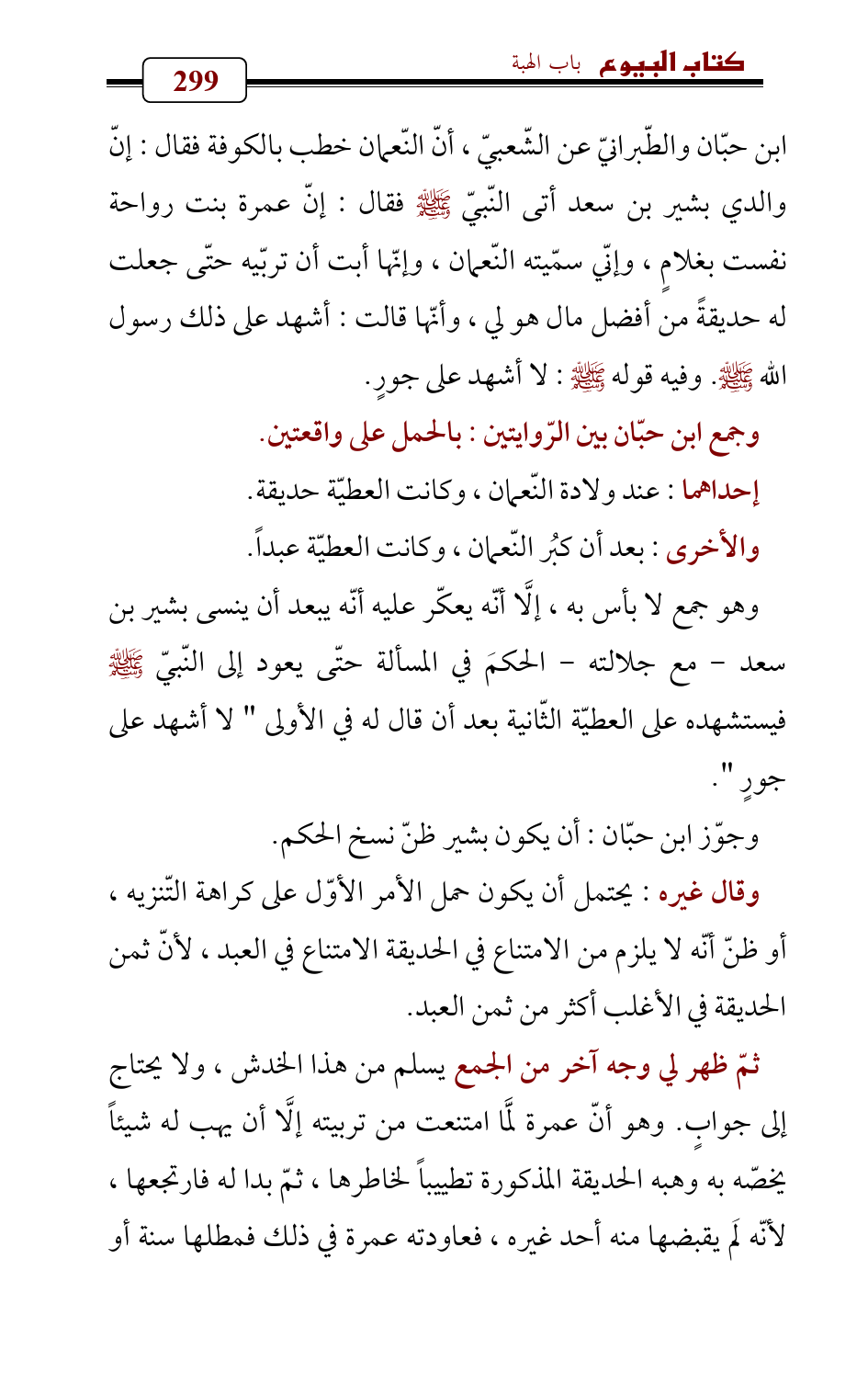 وهو جمع لا بأس به، إلَّا أنّه يعكّر عليه أنّه يبعد أن ينسى بشير بن سعد - مع جلالته - الحكمَ في المسألة حتّى يعود إلى النّبيّ - صلى الله عليه وسلم - فيستشهده على العطيّة الثّانية بعد أن قال له في الأولى " لا أشهد على جورٍ ".
