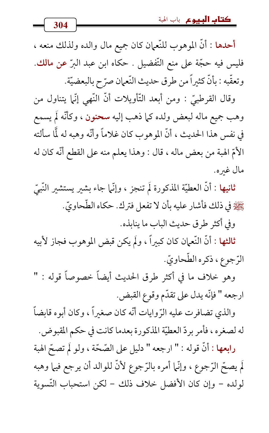 وقال القرطبيّ: ومن أبعد التّأويلات أنّ النّهي إنّما يتناول من وهب جميع ماله لبعض ولده كما ذهب إليه سحنون، وكأنّه لَم يسمع في نفس هذا الحديث , أنّ الموهوب كان غلاماً وأنّه وهبه له لَمَّا سألته الأمّ الهبة من بعض ماله، قال: وهذا يعلم منه على القطع أنّه كان له مال غيره.