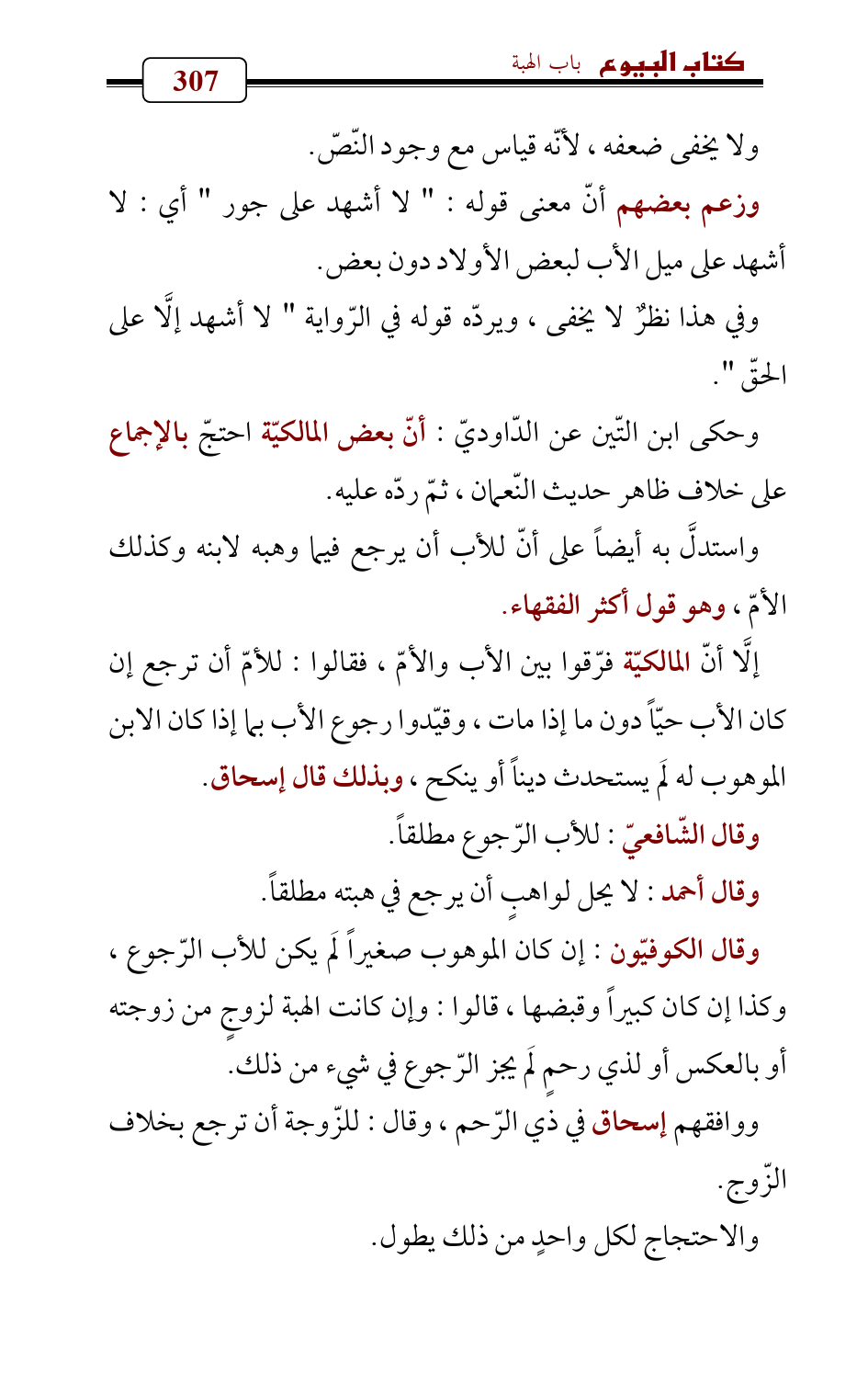 وقال الكوفيّون: إن كان الموهوب صغيراً لَم يكن للأب الرّجوع، وكذا إن كان كبيراً وقبضها، قالوا: وإن كانت الهبة لزوجٍ من زوجته أو بالعكس أو لذي رحمٍ لَم يجز الرّجوع في شيء من ذلك.
